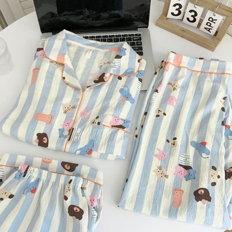 三件套纯棉夏季睡衣女款云朵棉短袖长裤日系ins风卡通少女家居服