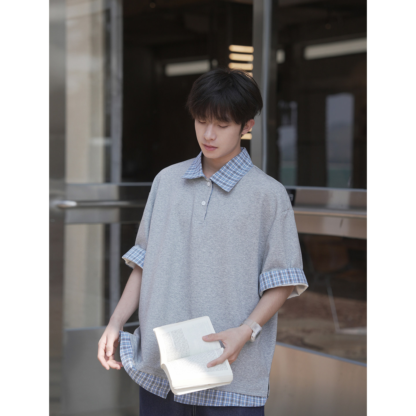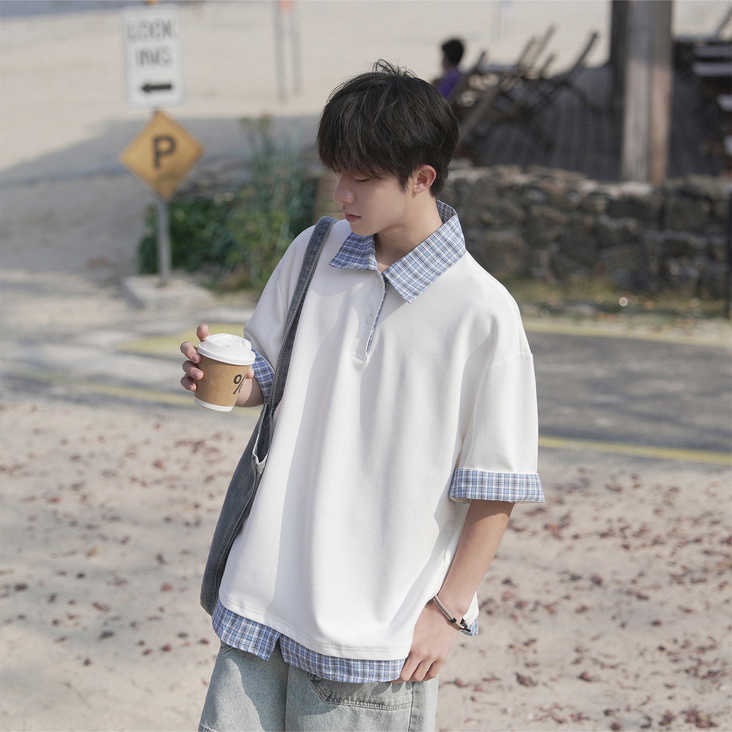 GOOZI MADE 假两件条纹polo衫短袖T恤男夏季青少年美式半袖上衣