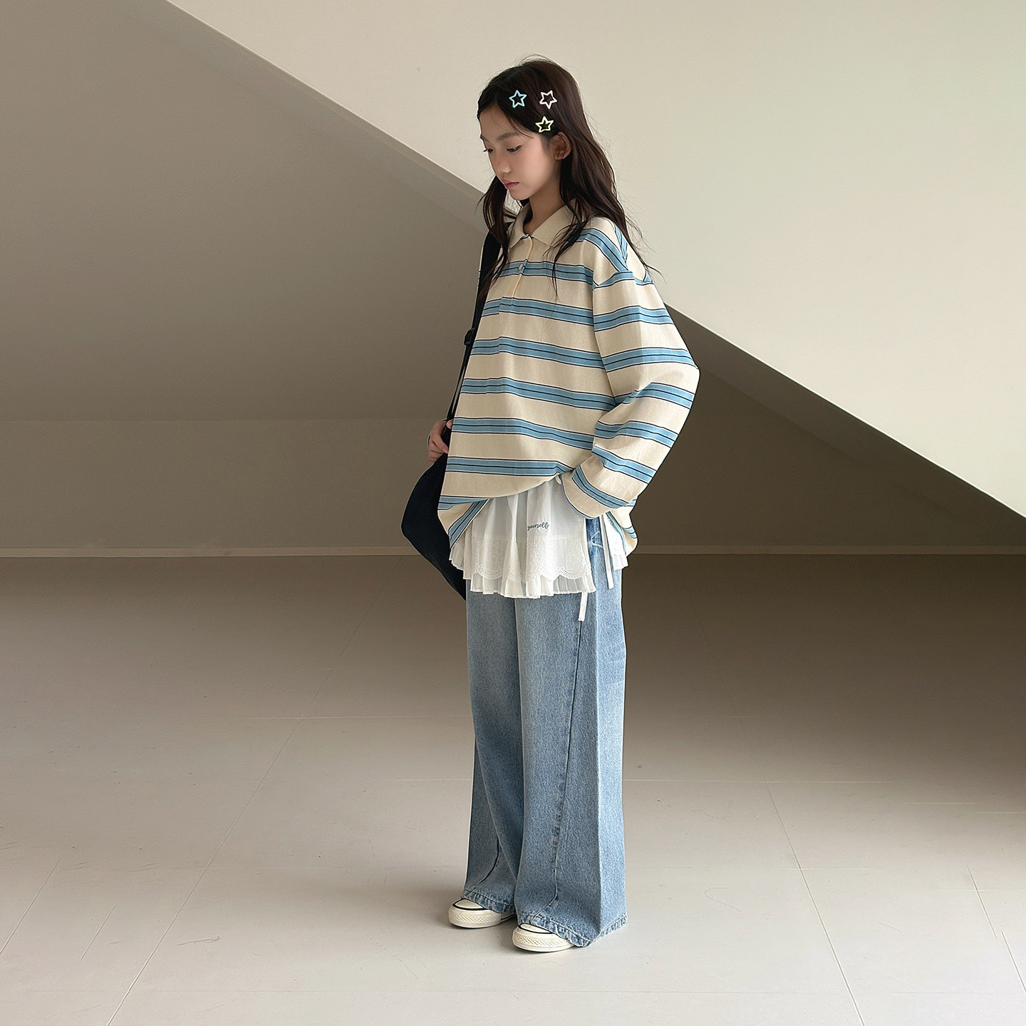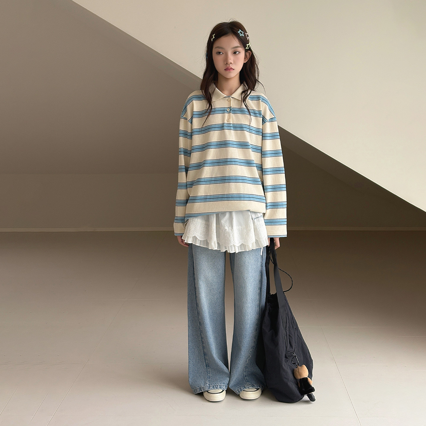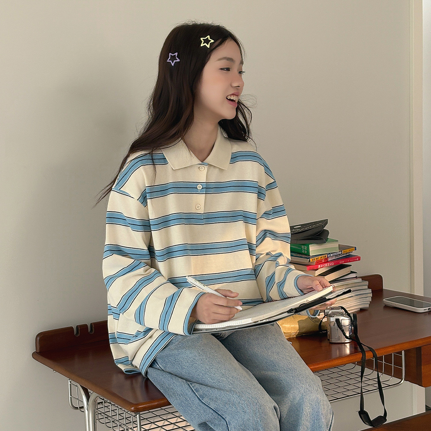 【书呆子】初中生女孩T恤2026春装新款青少年复古休闲条纹POLO衫