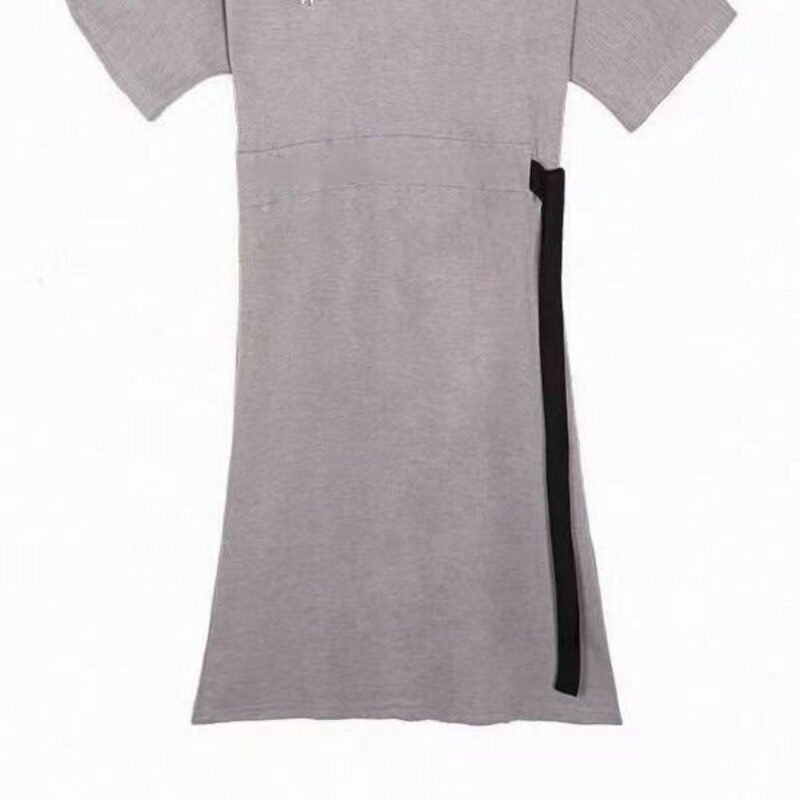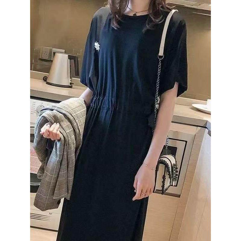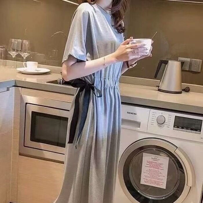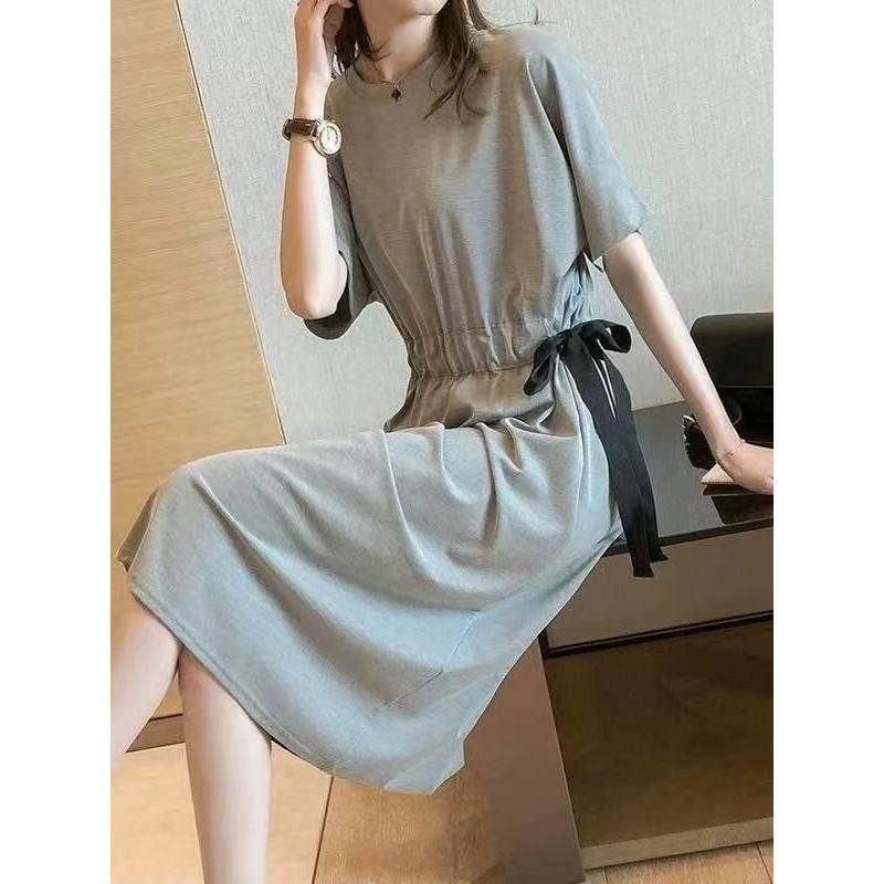 胖mm女装夏季韩版宽松大码T恤长裙绑带收腰显瘦遮肚子过膝连衣裙