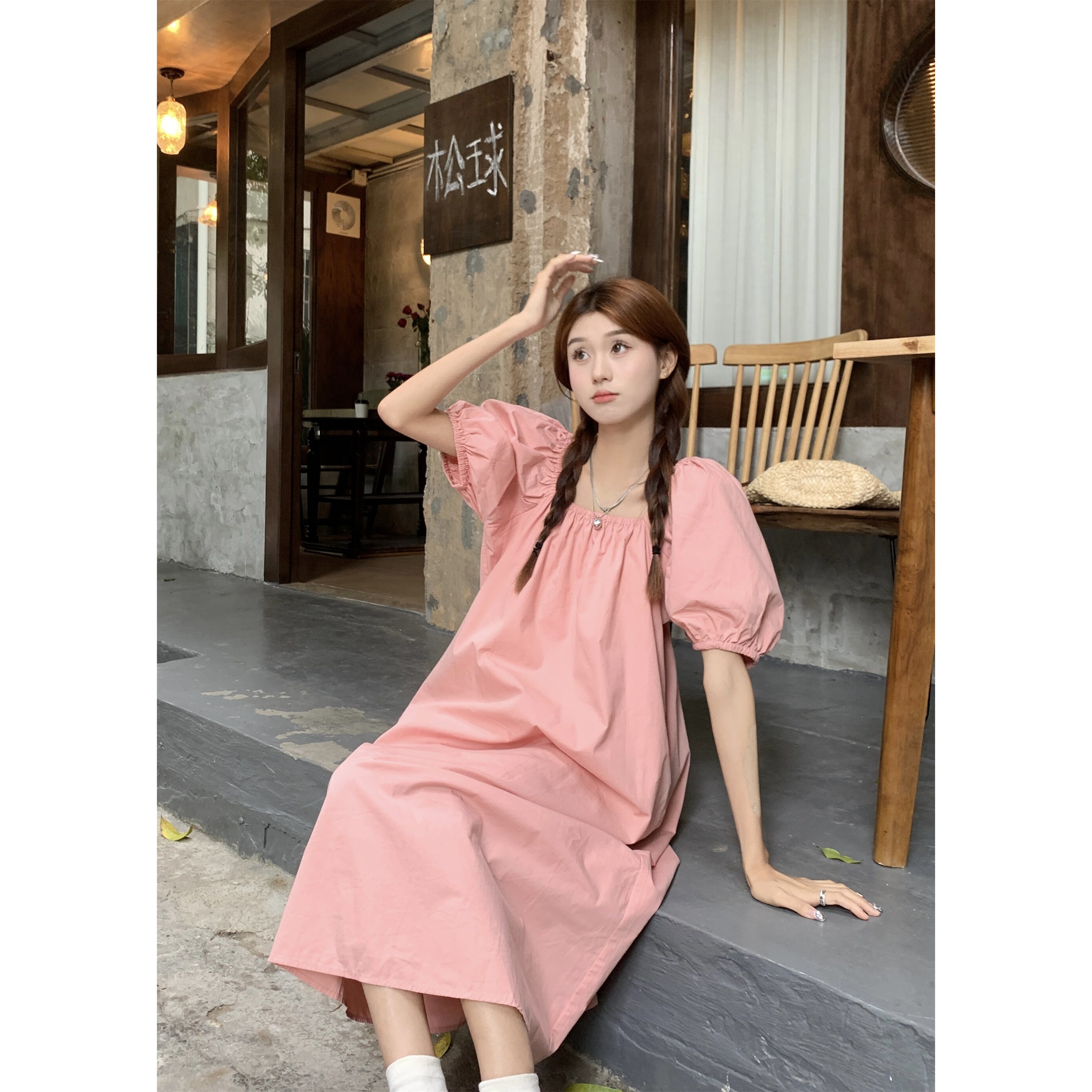 韩系温柔风泡泡袖粉色连衣裙女夏季宽松显瘦气质高级感小个子长裙
