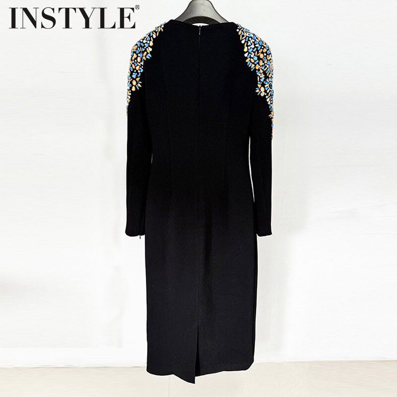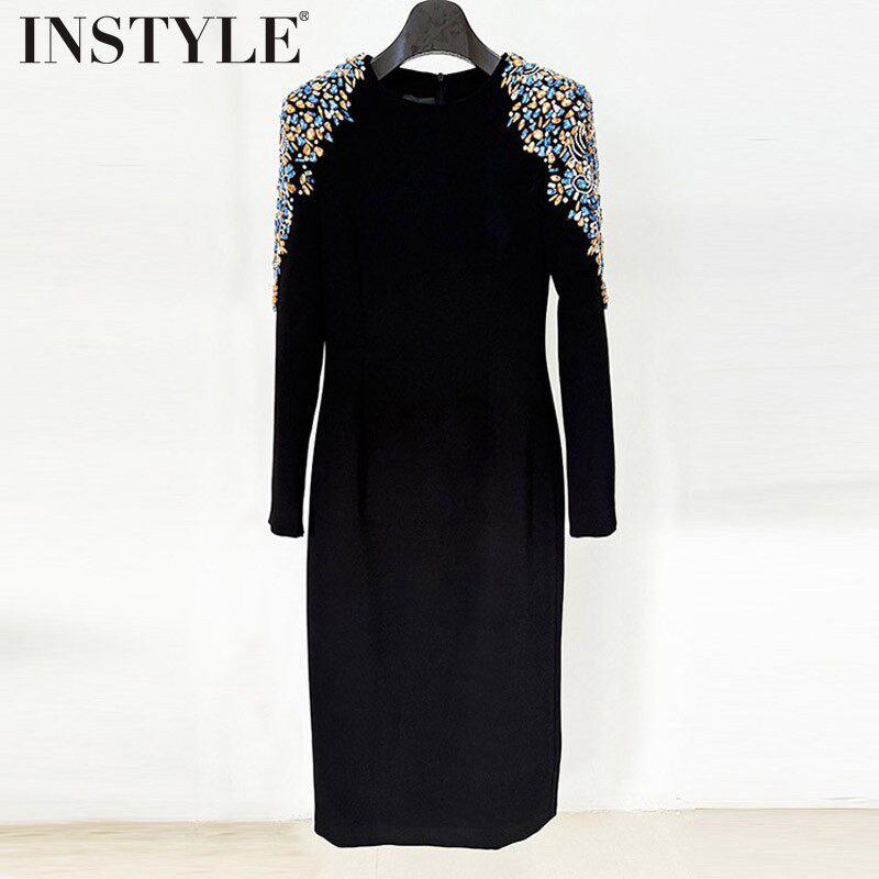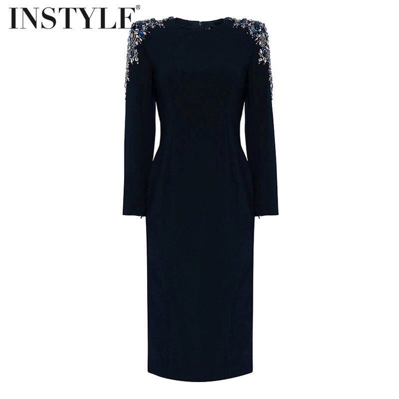 现货2026早春新款欧美重工钉珠钻蓝宝石圆领长袖修身中长款连衣裙