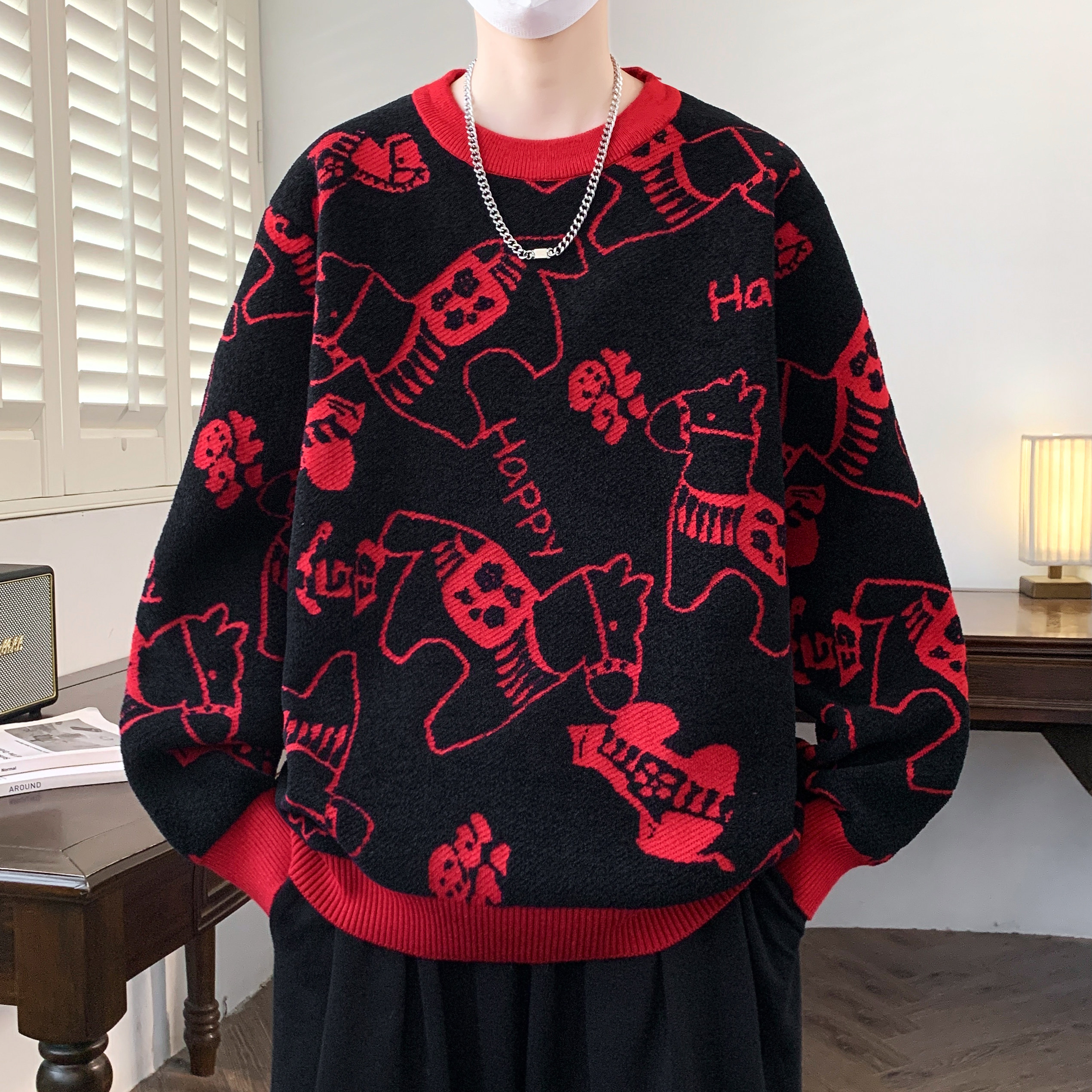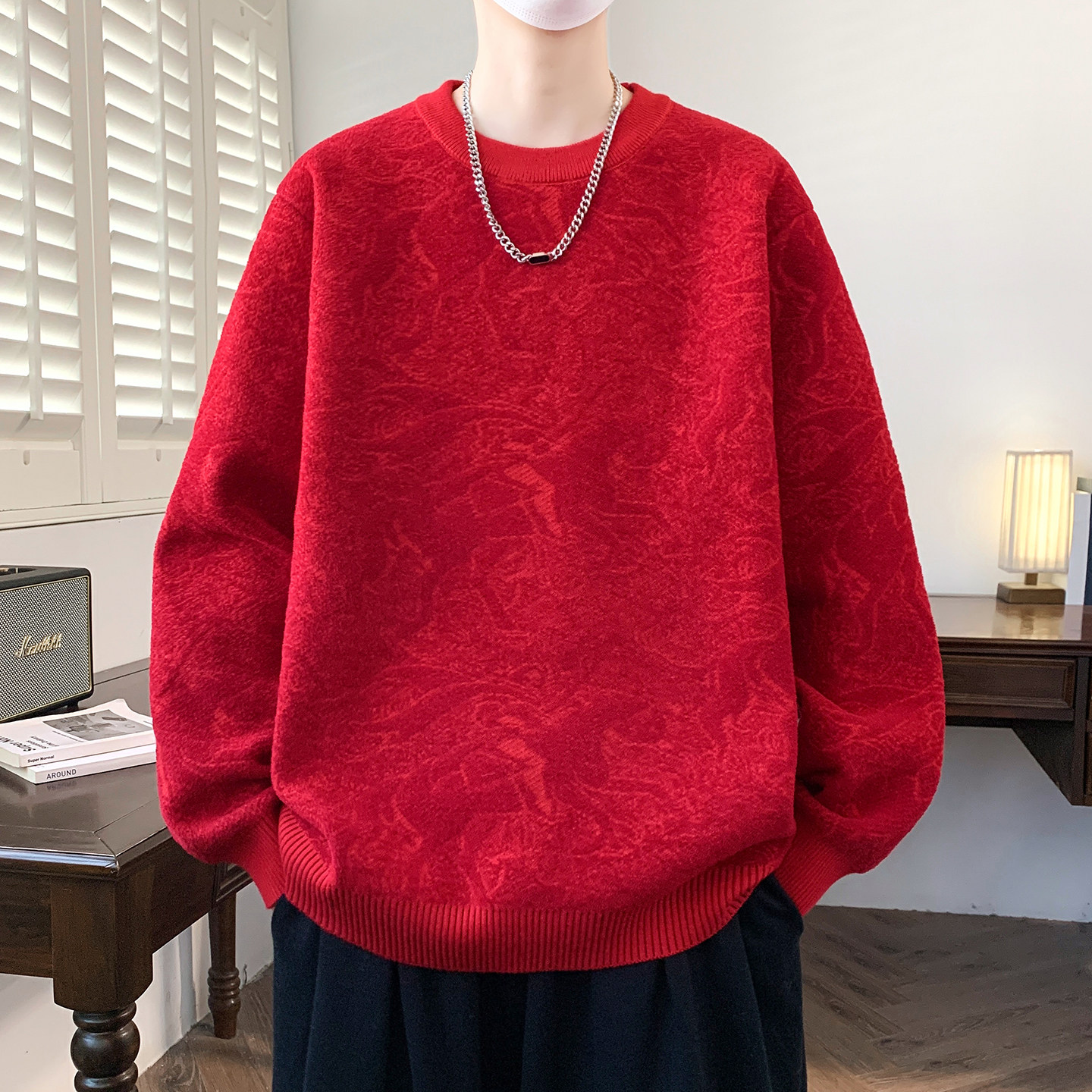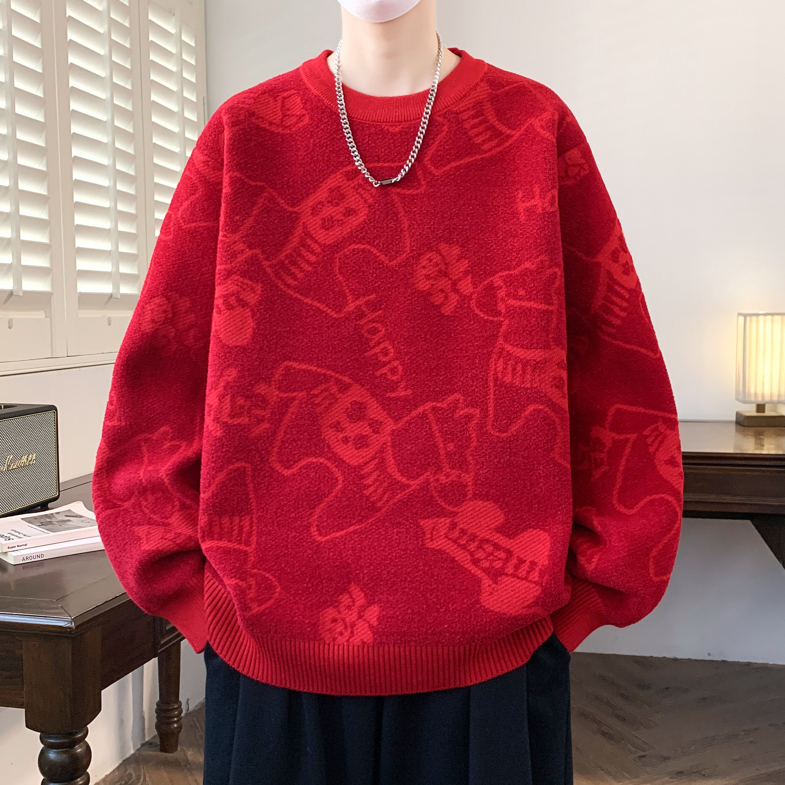 本命年红色毛衣男款冬季马年发财宽松针织衫新年喜庆线衣拜年服