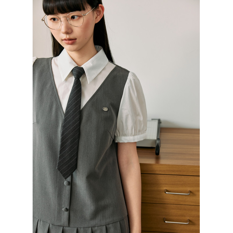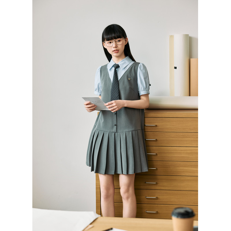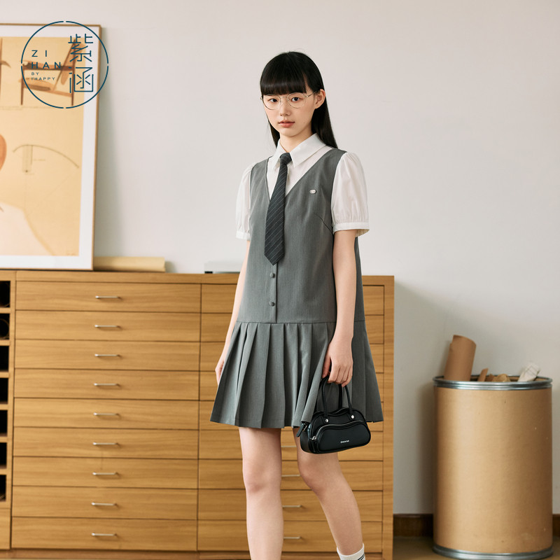 紫涵灰色假两件撞色拼接连衣裙女夏季新款学院风简约通勤百褶短裙