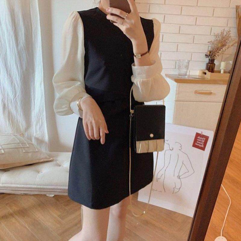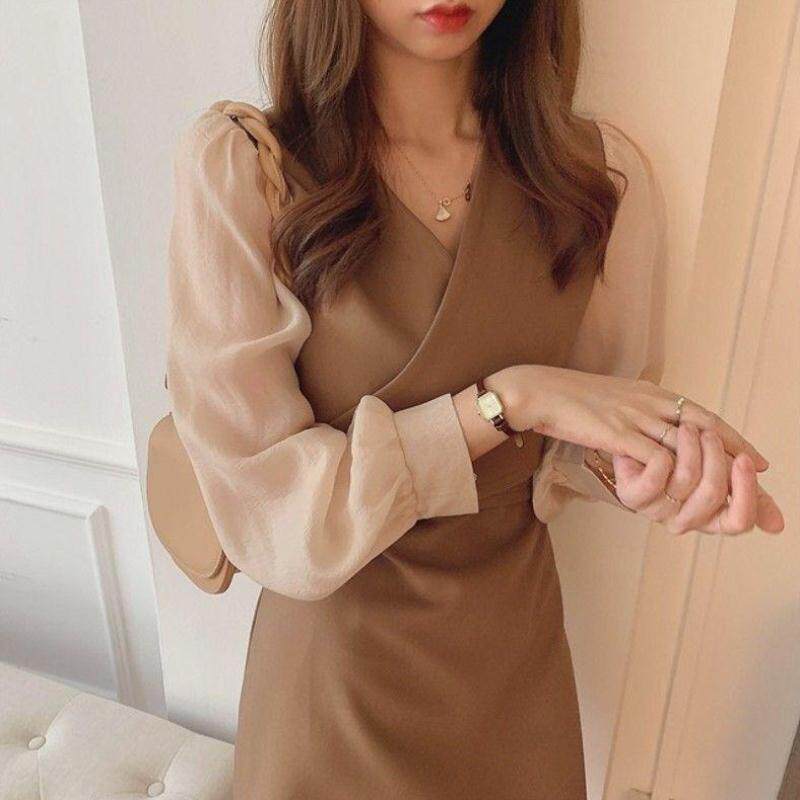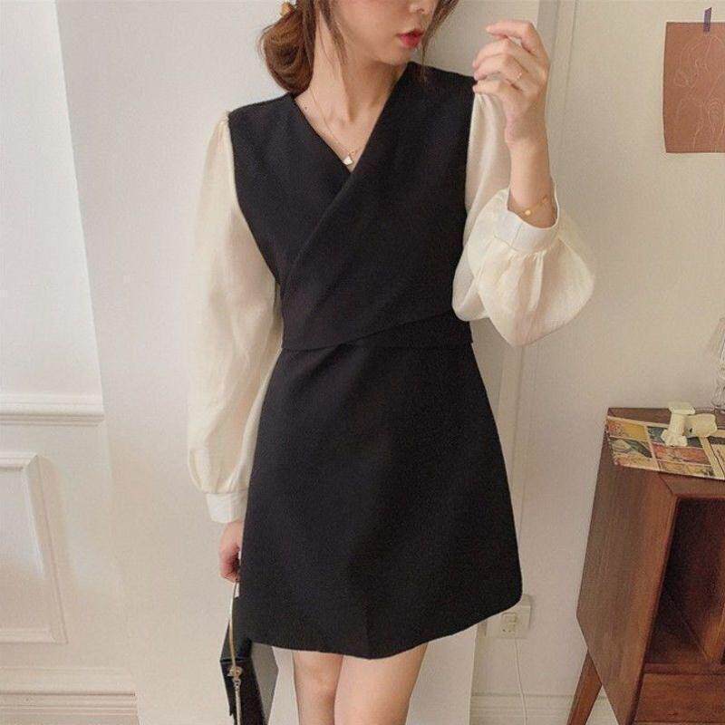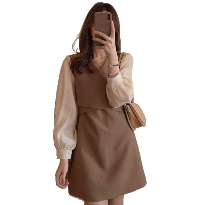 春夏长袖连衣裙收腰显瘦V领打底裙女新款假两件洋气小个子短裙子