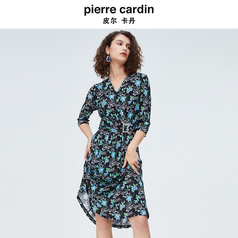 皮尔卡丹女装雪纺印花连衣裙女夏新款法式海边度假裙日常通勤长裙