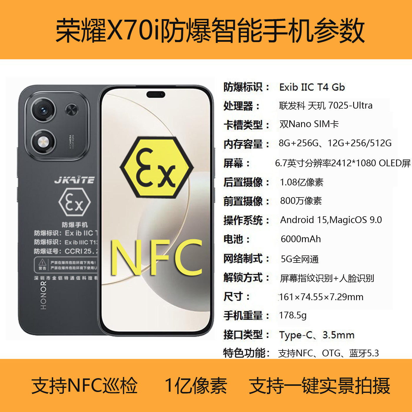 honor/荣耀 X70i防爆智能手机化工厂石油本安气体EXT4带NFC金铠特