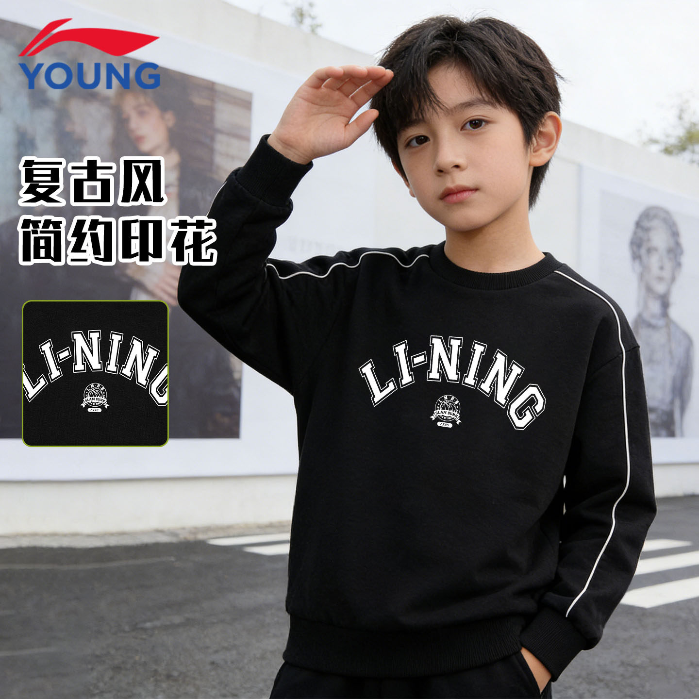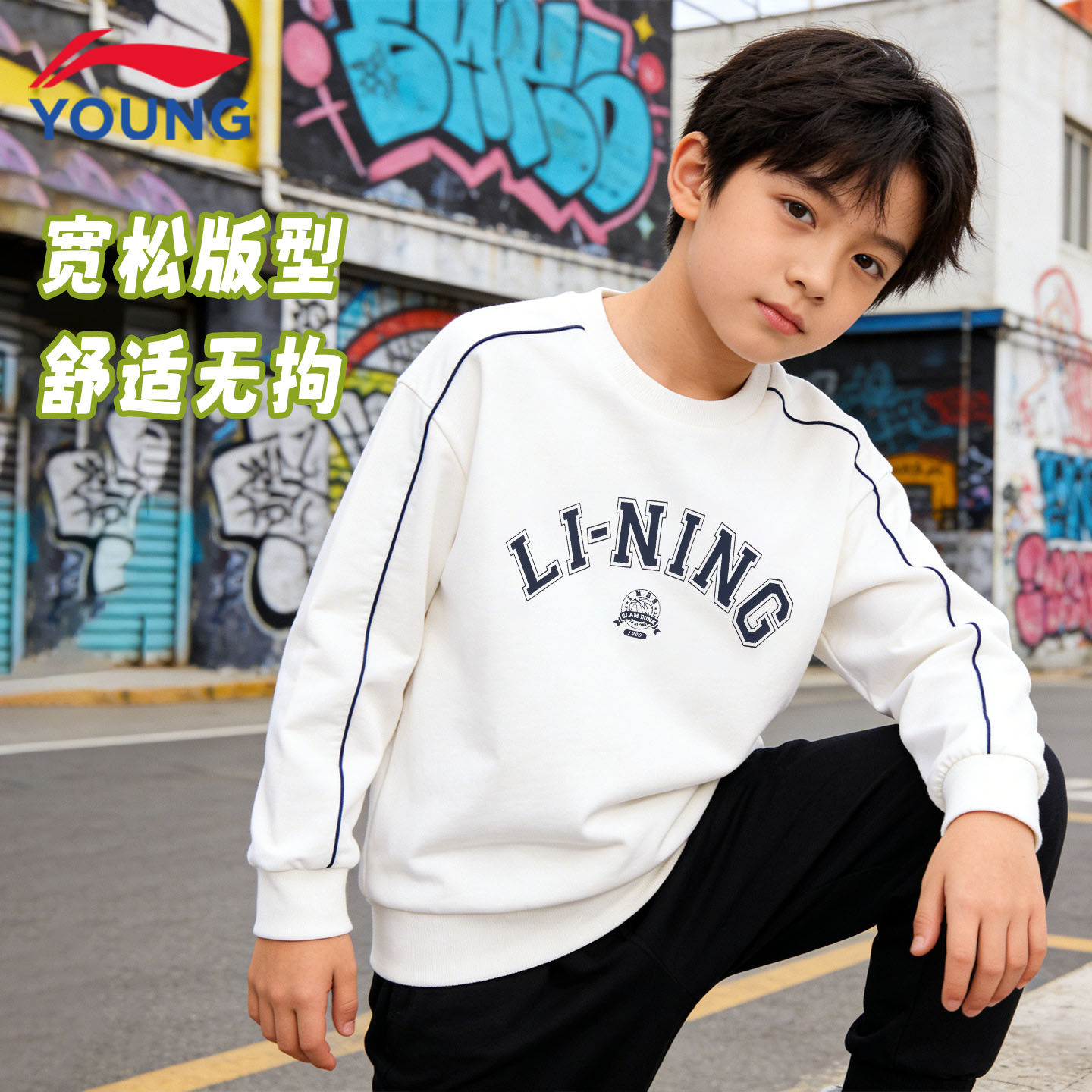 李宁儿童卫衣男童春新款运动休闲宽松舒适套头毛圈青少年百搭上衣