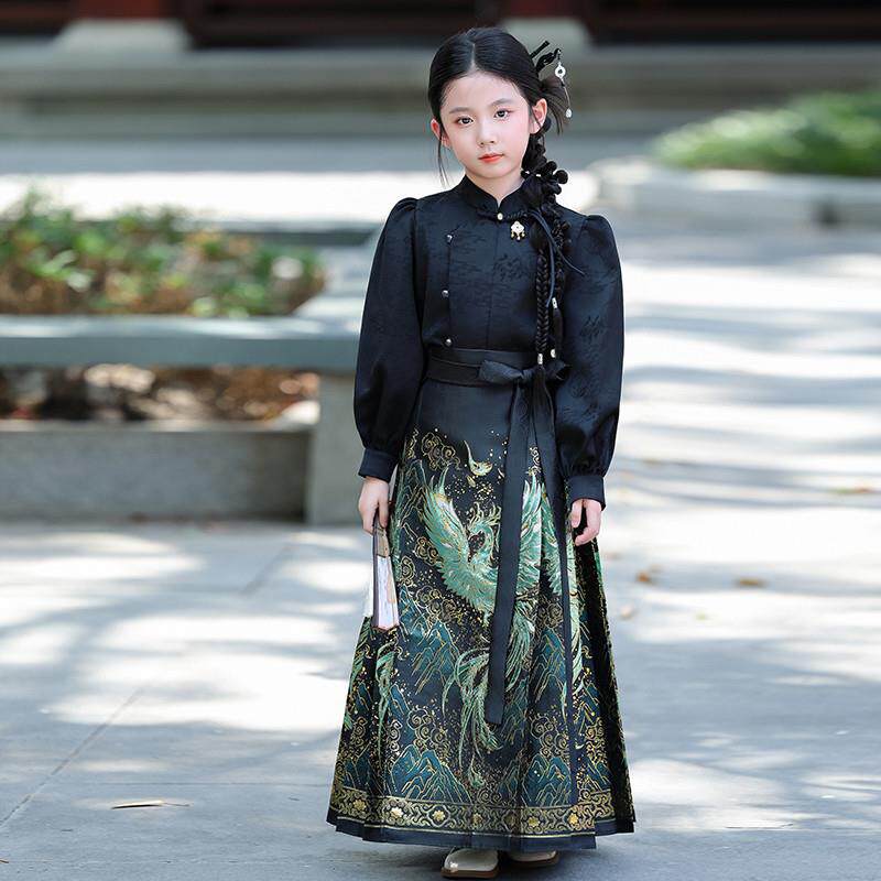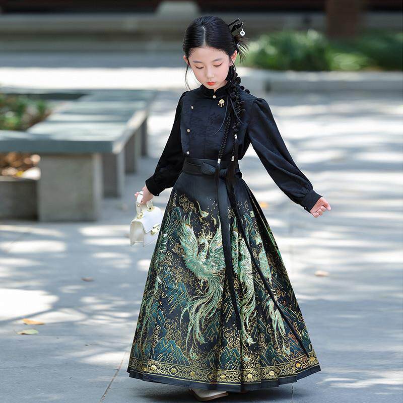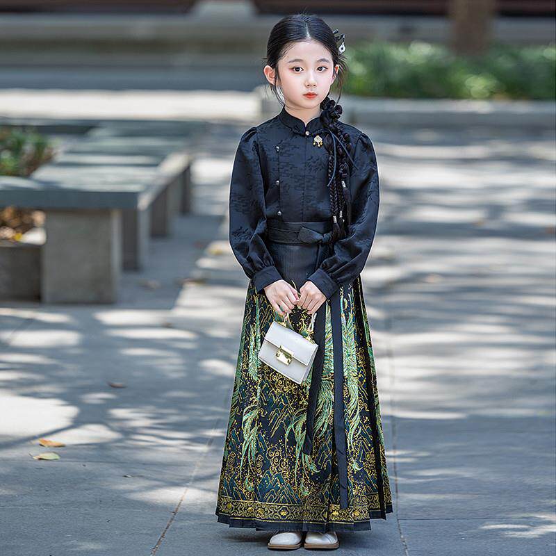 高级感织金马面裙套装女童黑色长袖上衣国风新中式小女孩唐装长裙