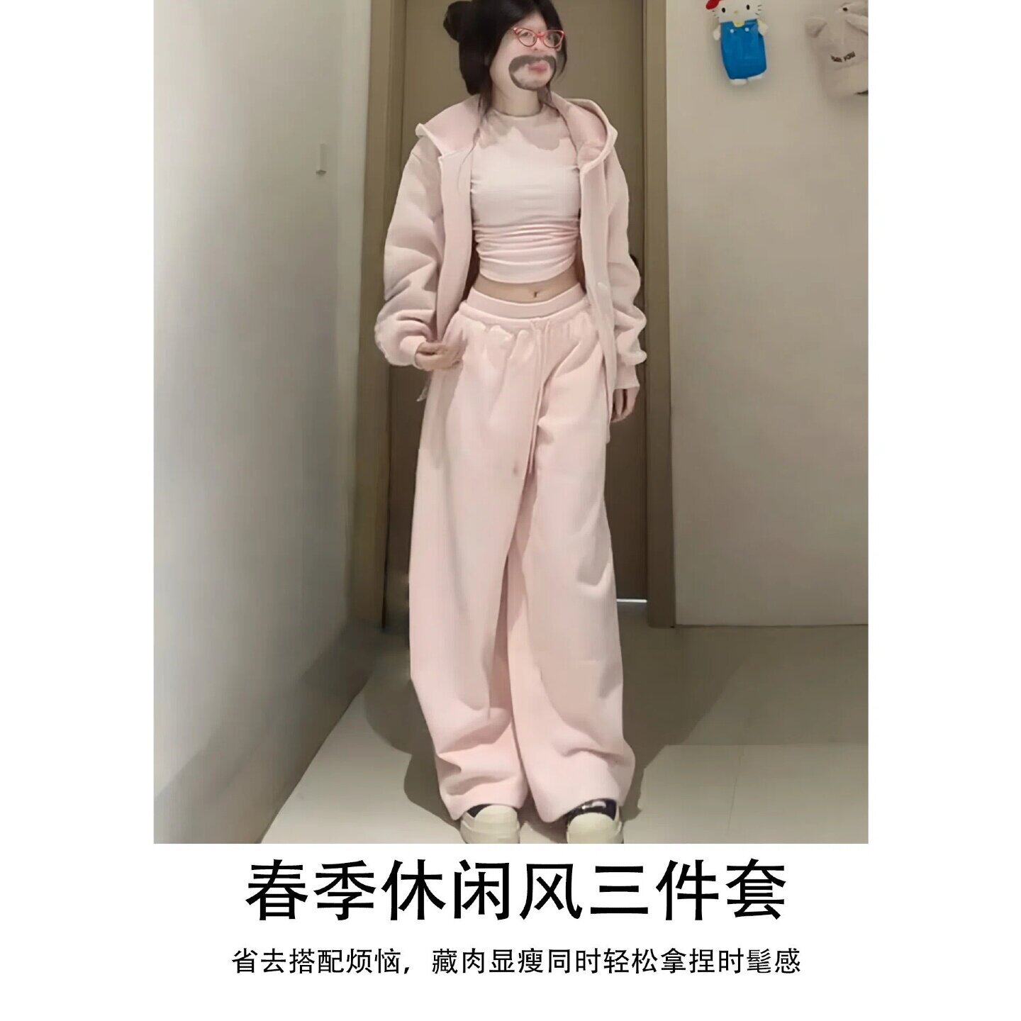 粉色早春套装2026新款女装运动休闲韩系穿搭一整套装卫衣裤三件套