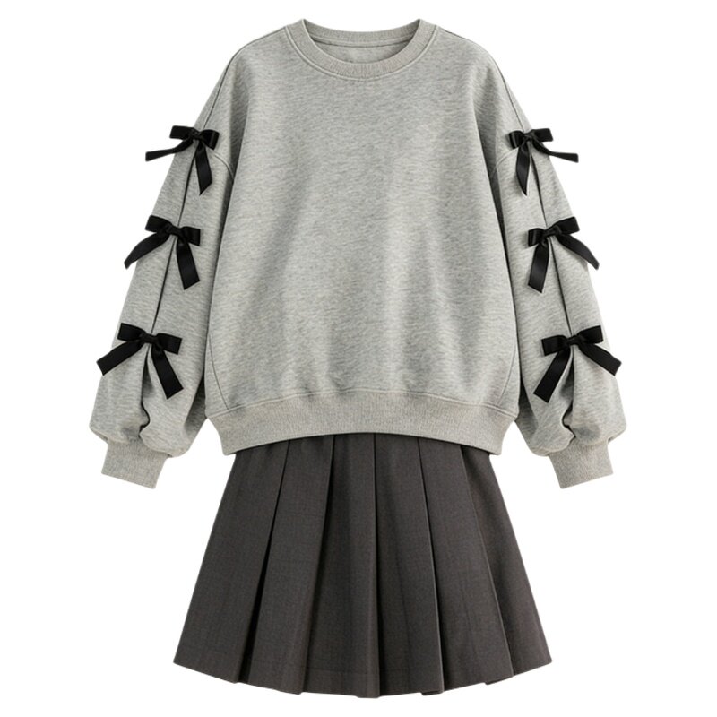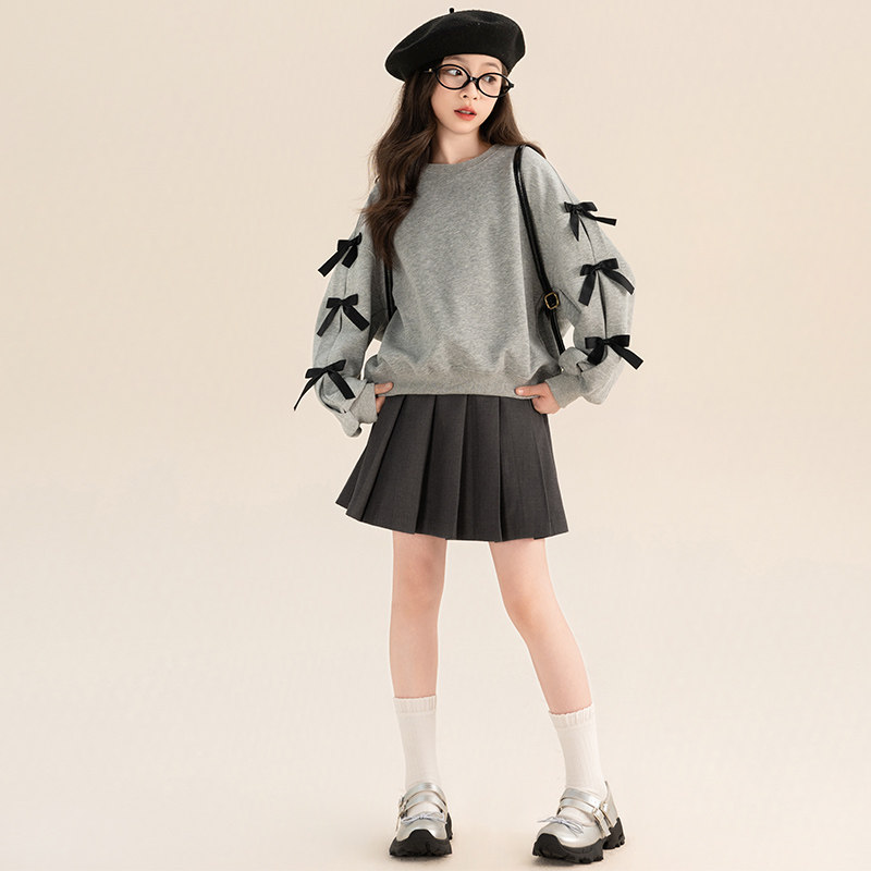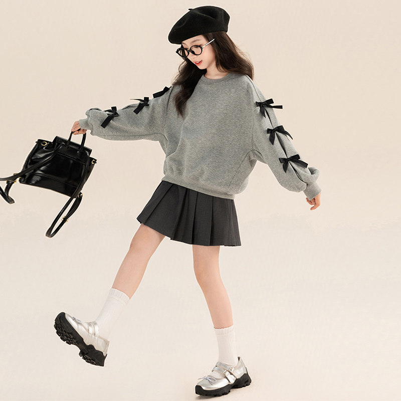 女童洋气套装裙学院风春秋中大童蝴蝶结炸街儿童卫衣百褶裙两件套