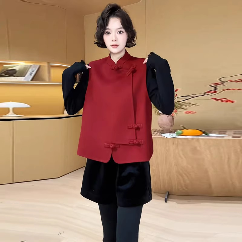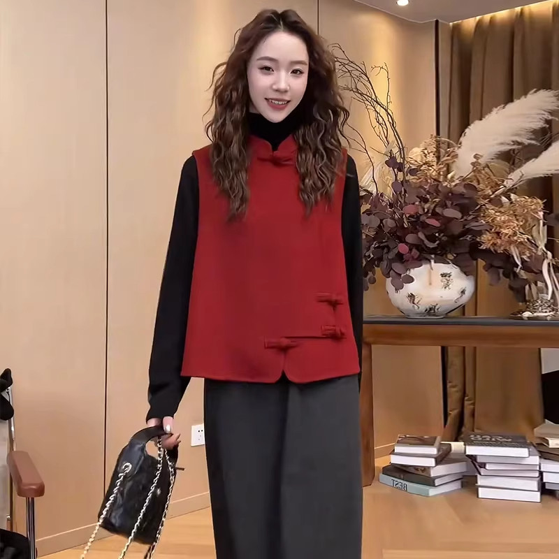 新中式国风盘扣马甲外套女2026早春新款大码胖mm新年红色马夹上衣