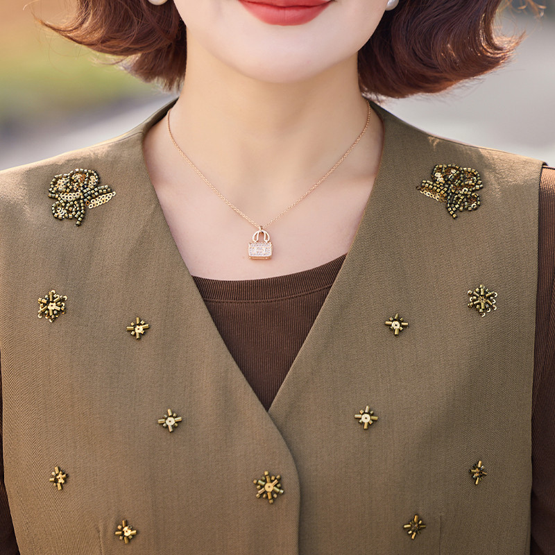 春装新款钉珠三件套妈妈装春秋季长袖T恤马夹休闲长裤套装中老年