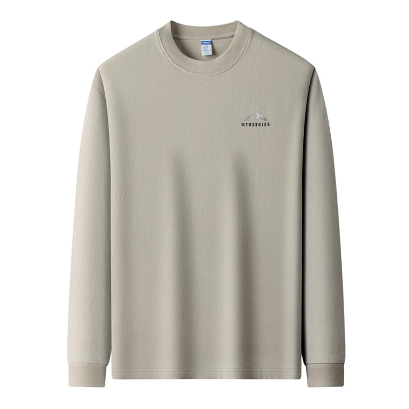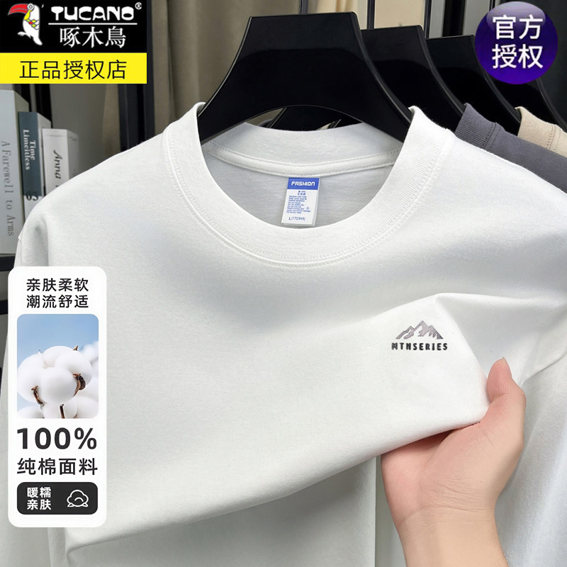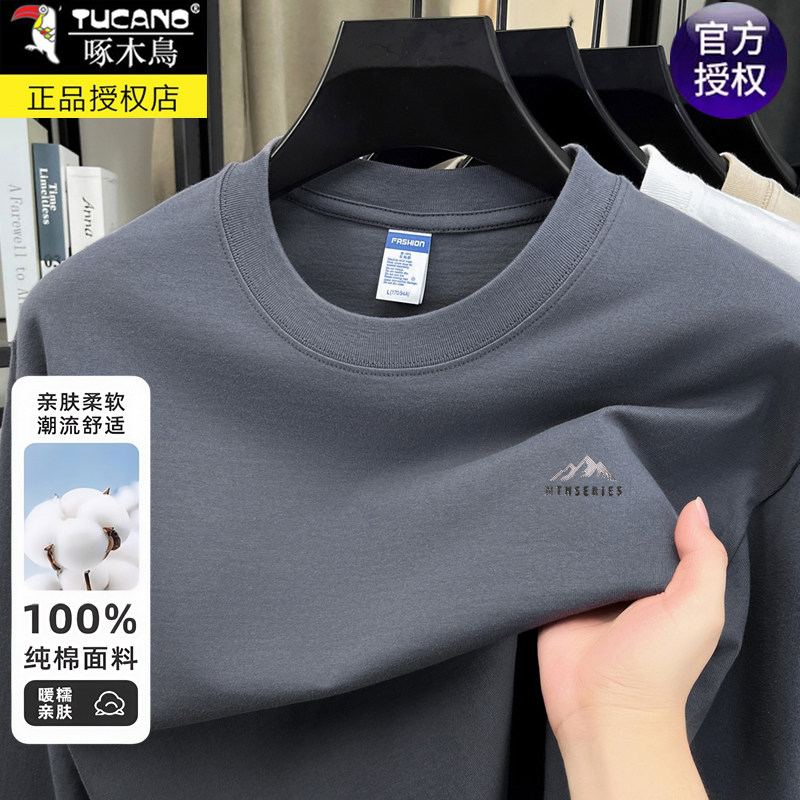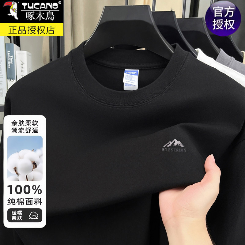 啄木鸟重磅100%纯棉男款长袖t恤春秋圆领卫衣白色内搭打底衫上衣T