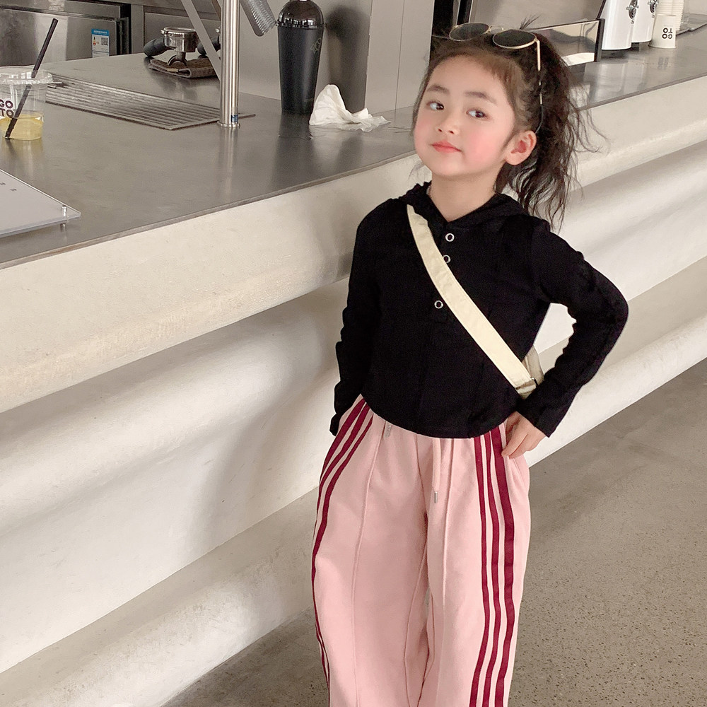 女童连帽卫衣春秋儿童女大童春装黑色短款衣服网红休闲小女孩上衣