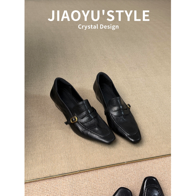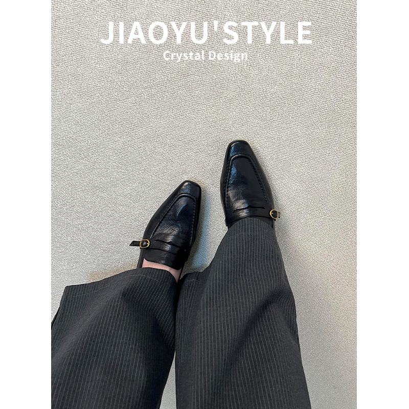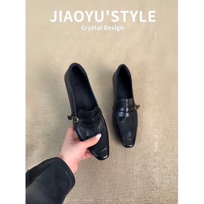 真皮~骄屿复古方头粗跟乐福鞋通勤鞋气质一脚蹬单鞋皮带扣小皮鞋
