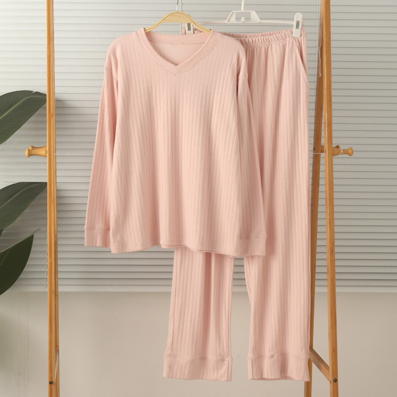 女士针织纯棉加厚套头长袖长裤带口袋睡衣家居服套装春秋大码全棉