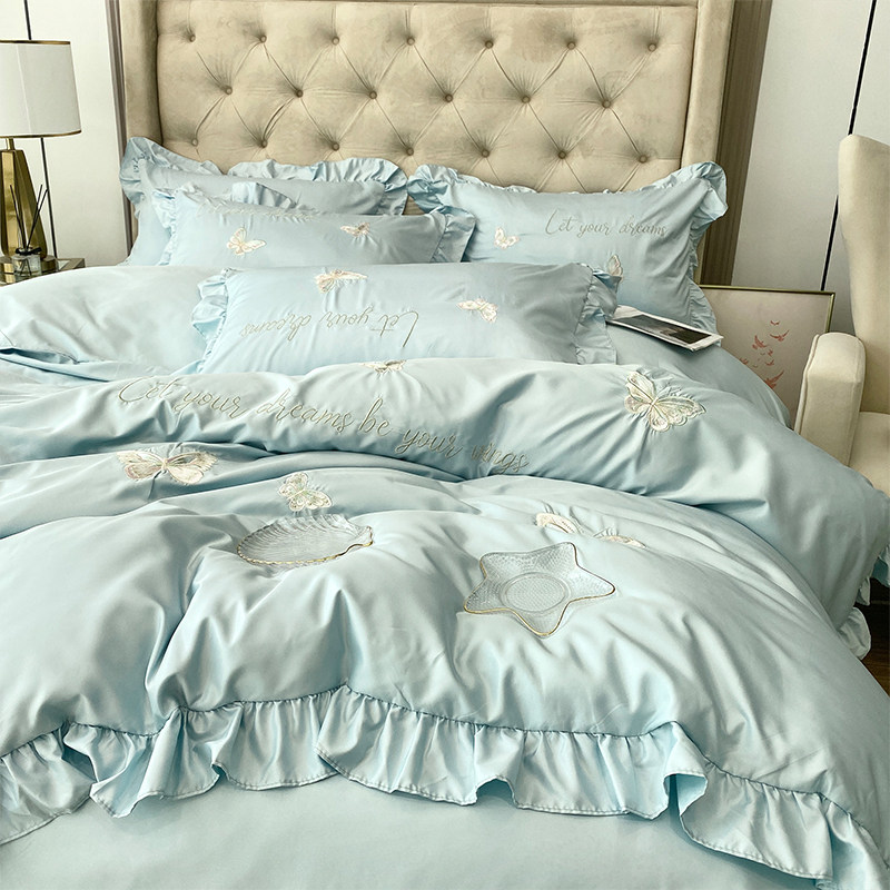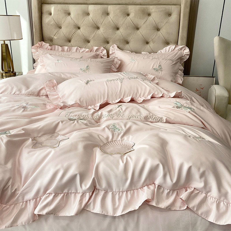 小清新夏季冰丝床上四件套真丝裸睡丝滑被套床笠R款公主风粉色床