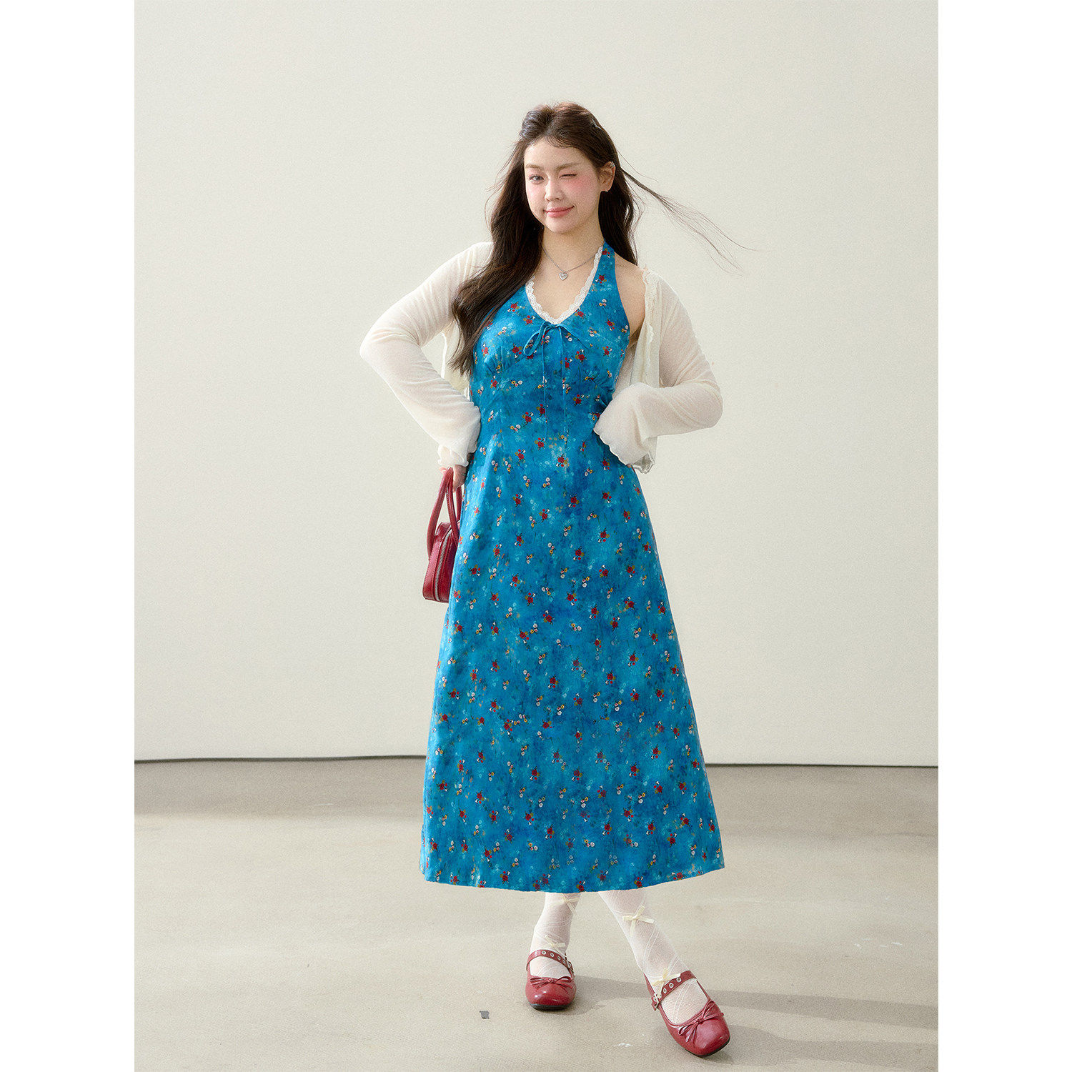 张大人大码女装胖妹妹mm显瘦碎花连衣裙海边度假风夏日漂亮挂脖裙