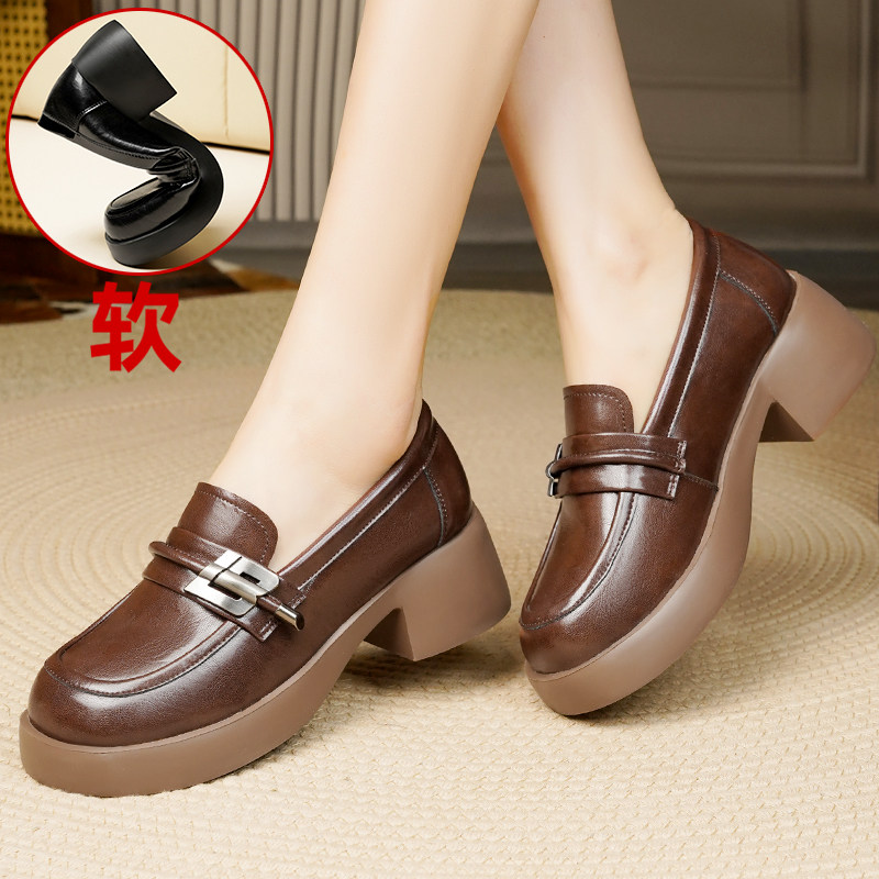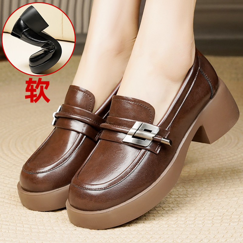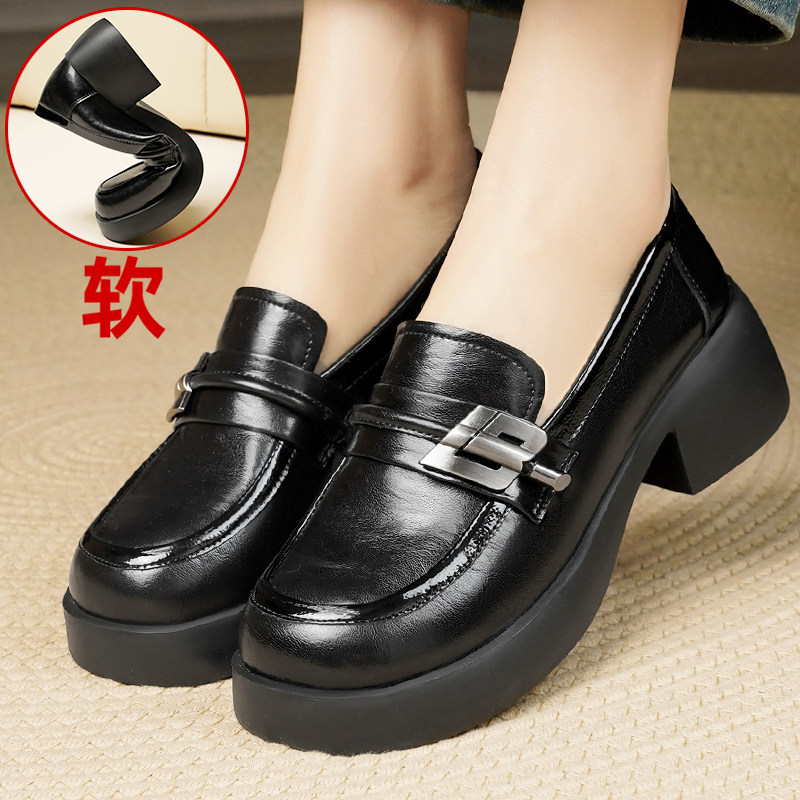 厚底乐福鞋女真皮软底不累脚黑色皮鞋粗跟软皮单鞋中跟一脚蹬女鞋