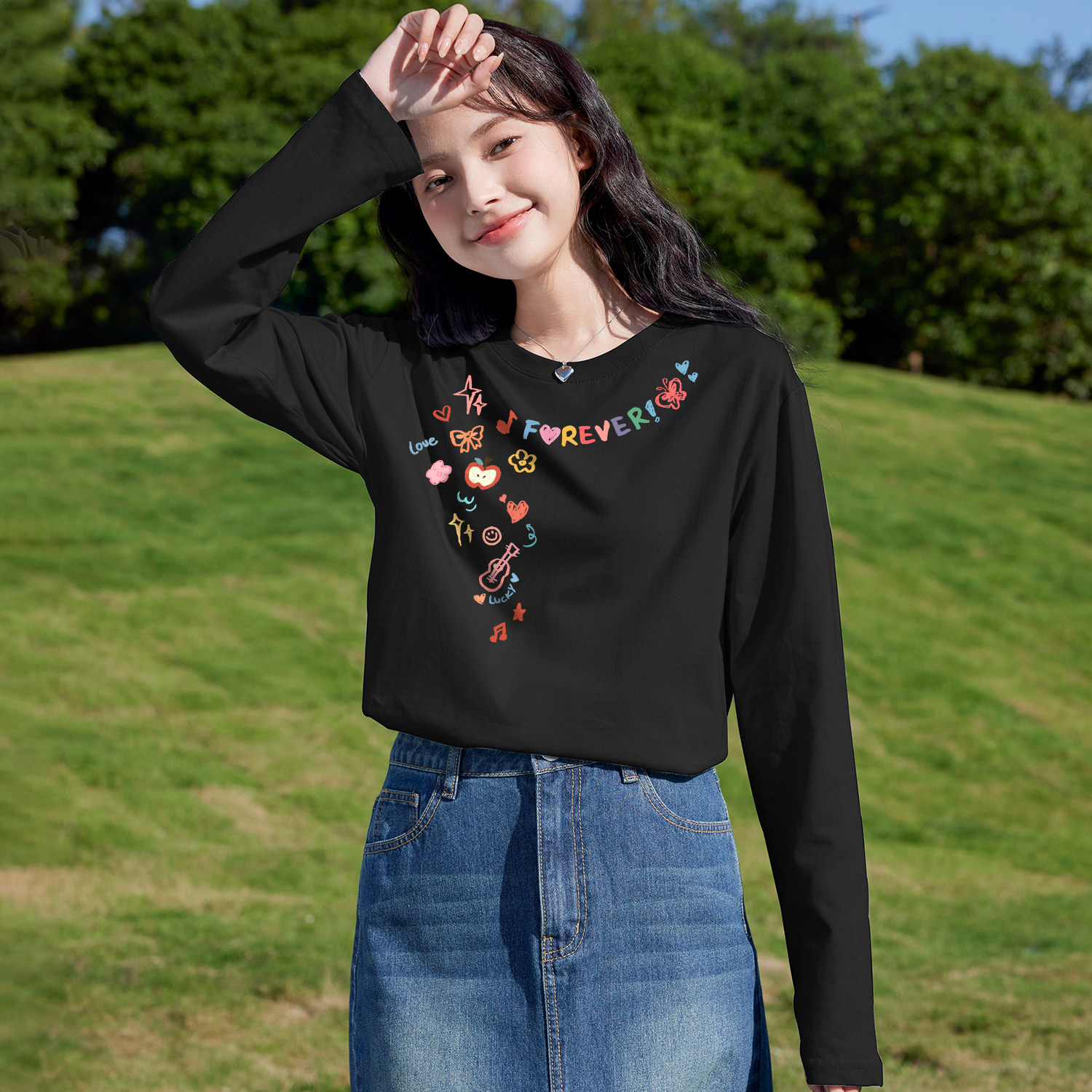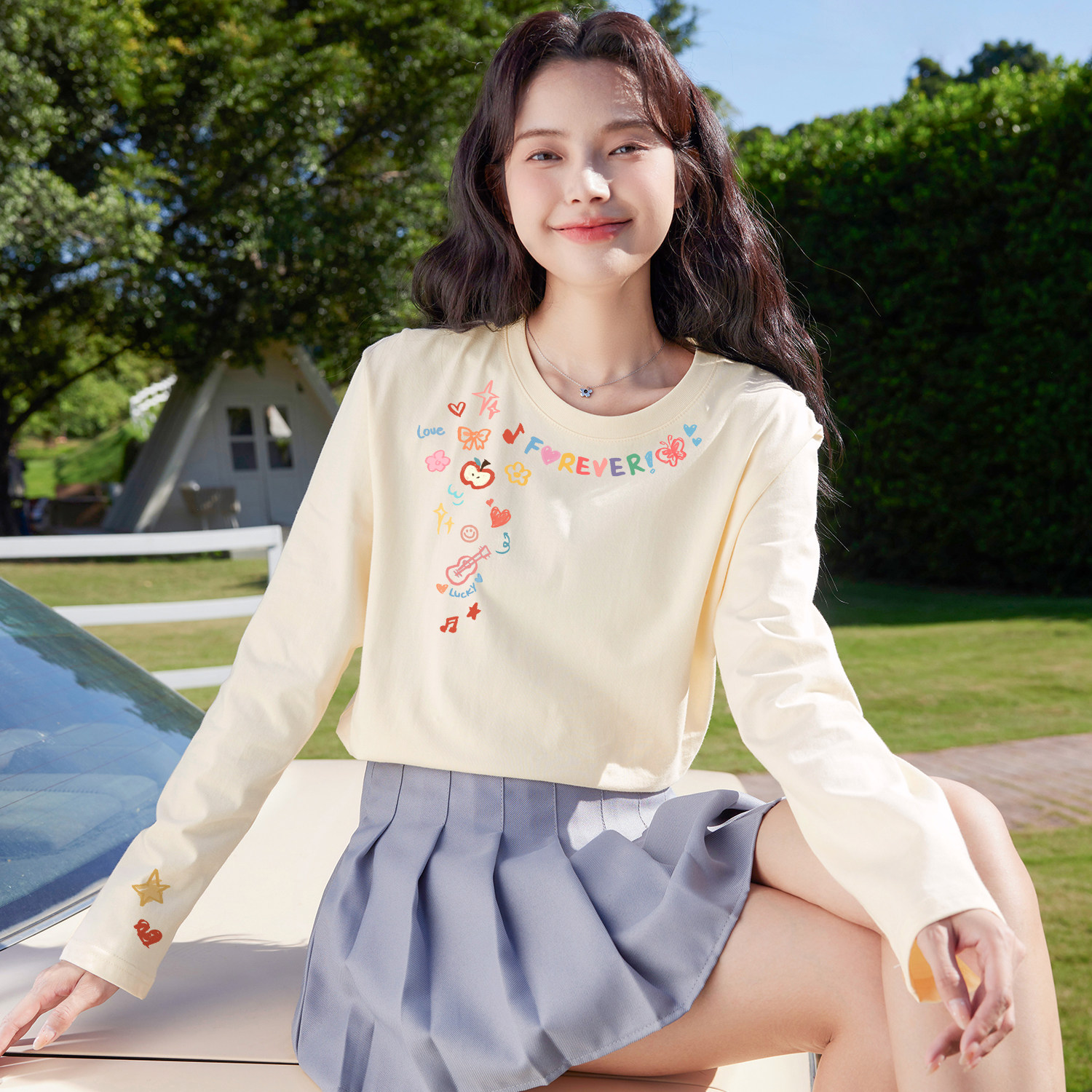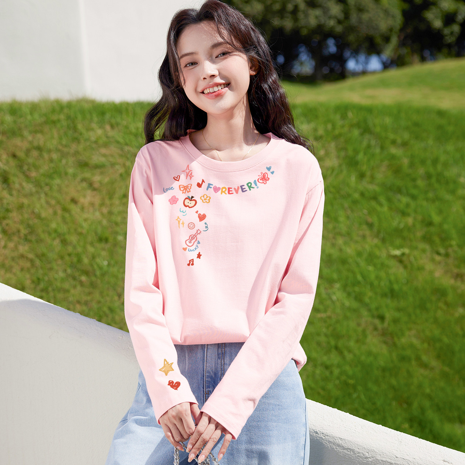 班尼路纯棉白色长袖t恤女款2026春季新款圆领简约内搭打底衫上衣H