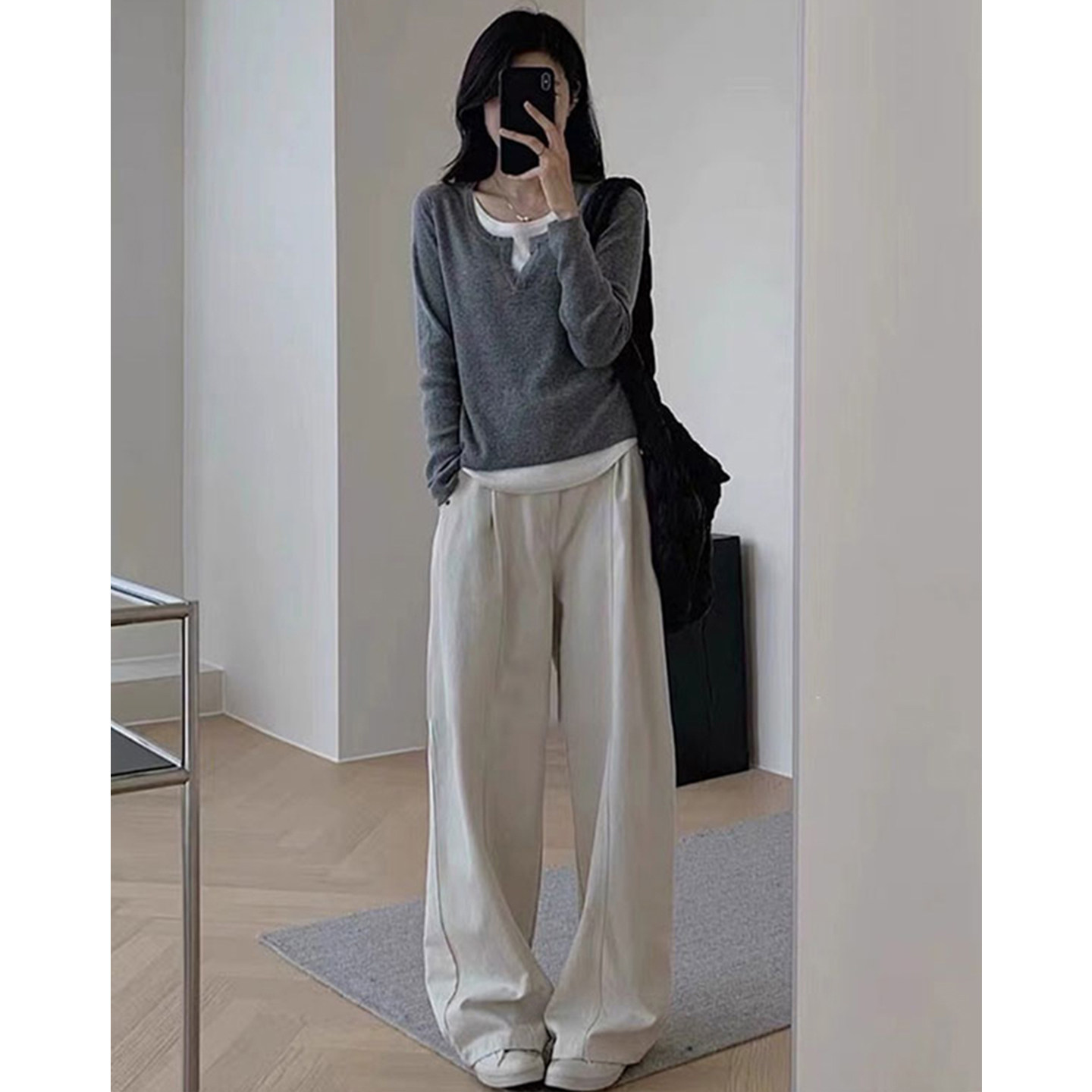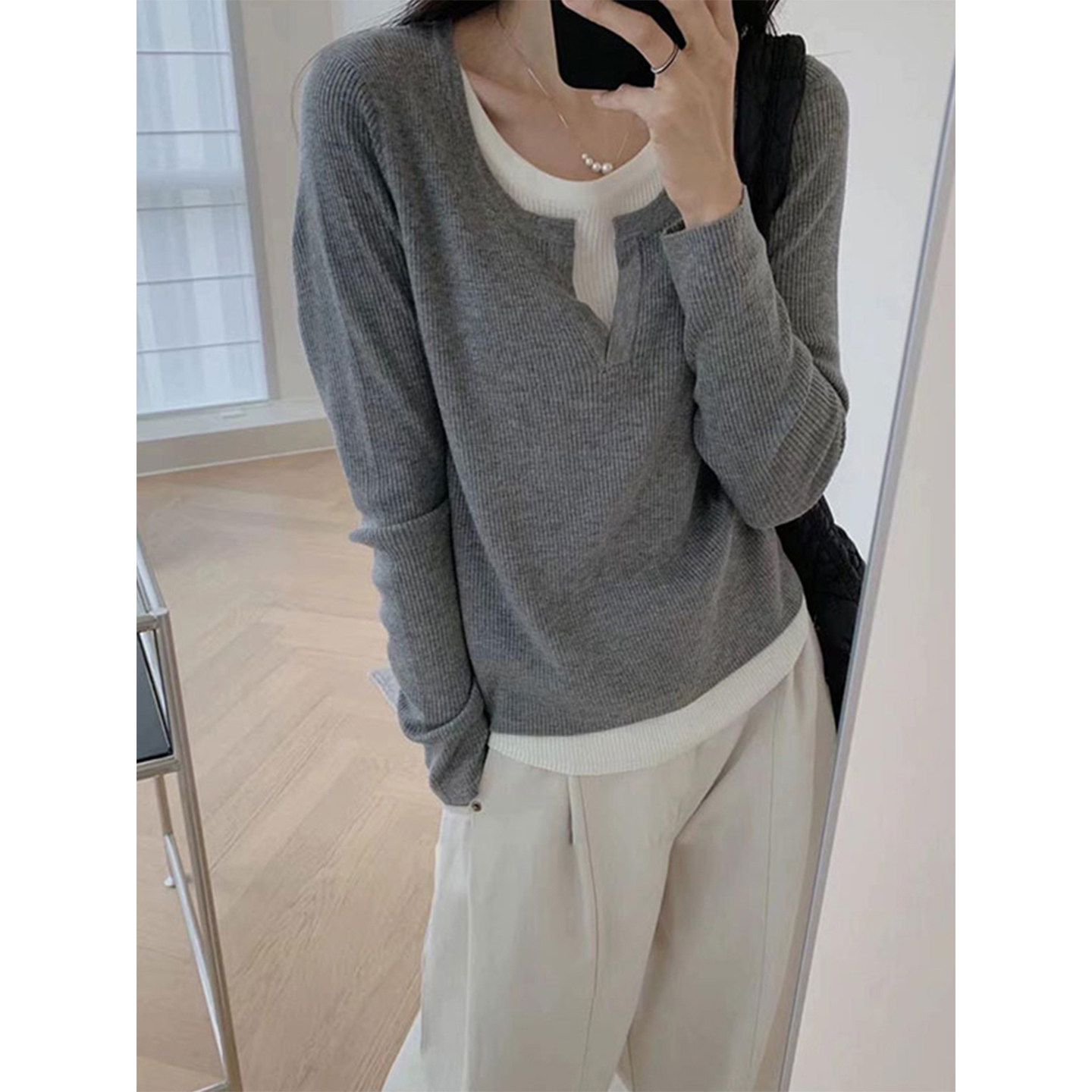 黑色假两件v领长袖t恤女夏季2026新款内搭修身显瘦打底春秋款上衣