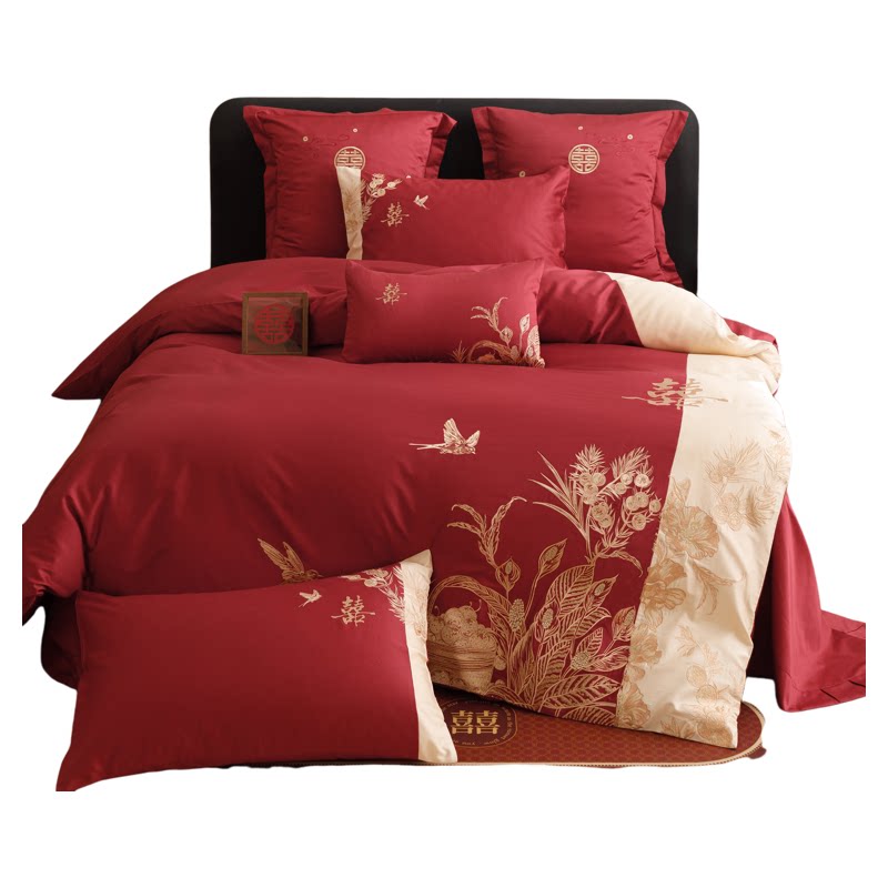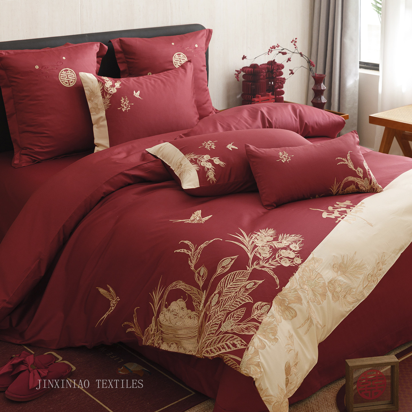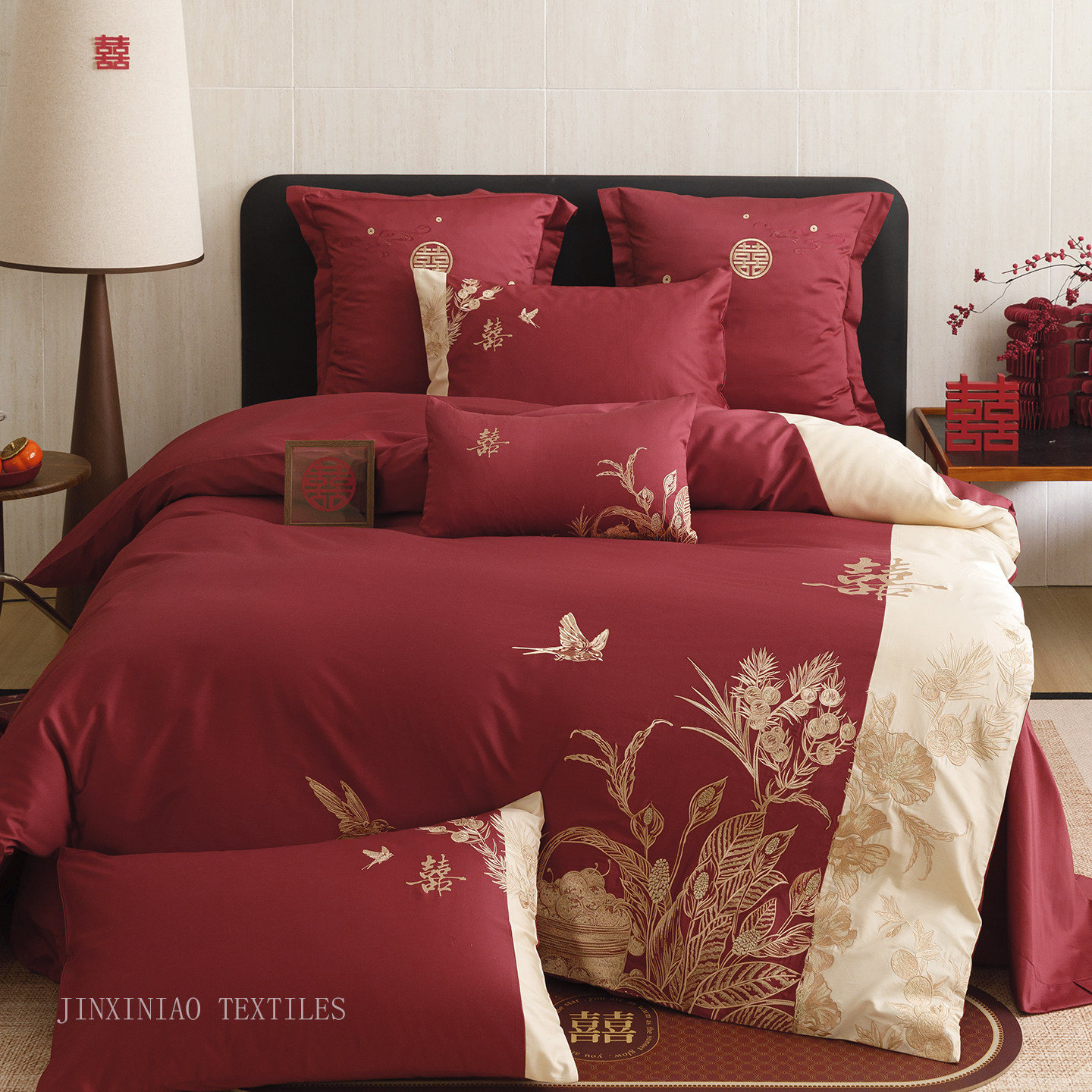 高端婚礼陪嫁年轻人结婚四件套全棉婚庆大红色刺绣床品喜被陪嫁