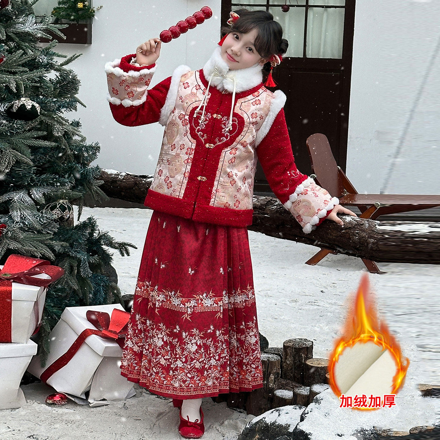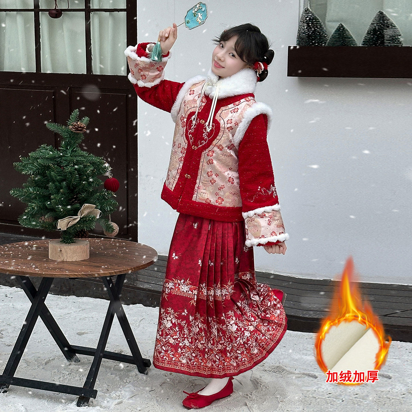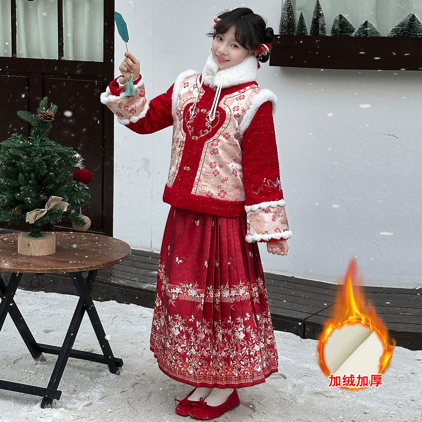 女童裙子冬季2025新款中大童国潮红色拜年服儿童冬装马面裙套装潮