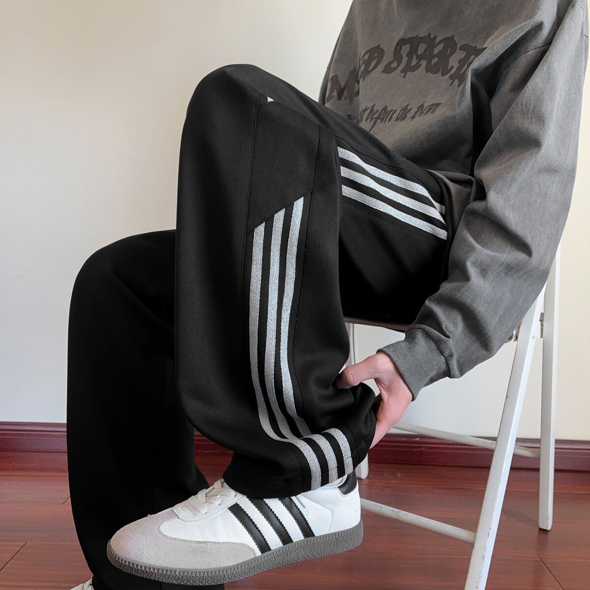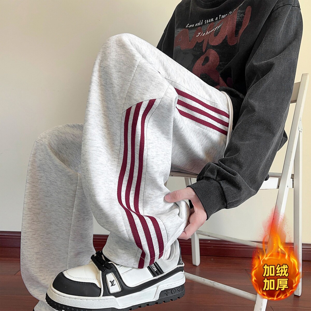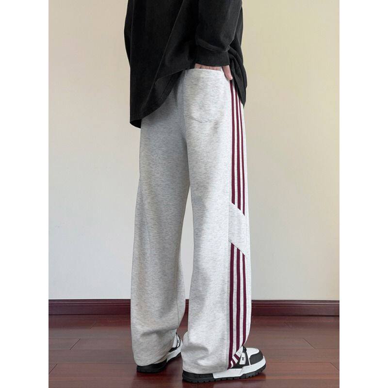 青少年酷帅裤子男款春季三杠条纹运动卫裤美式复古直筒阔腿休闲裤