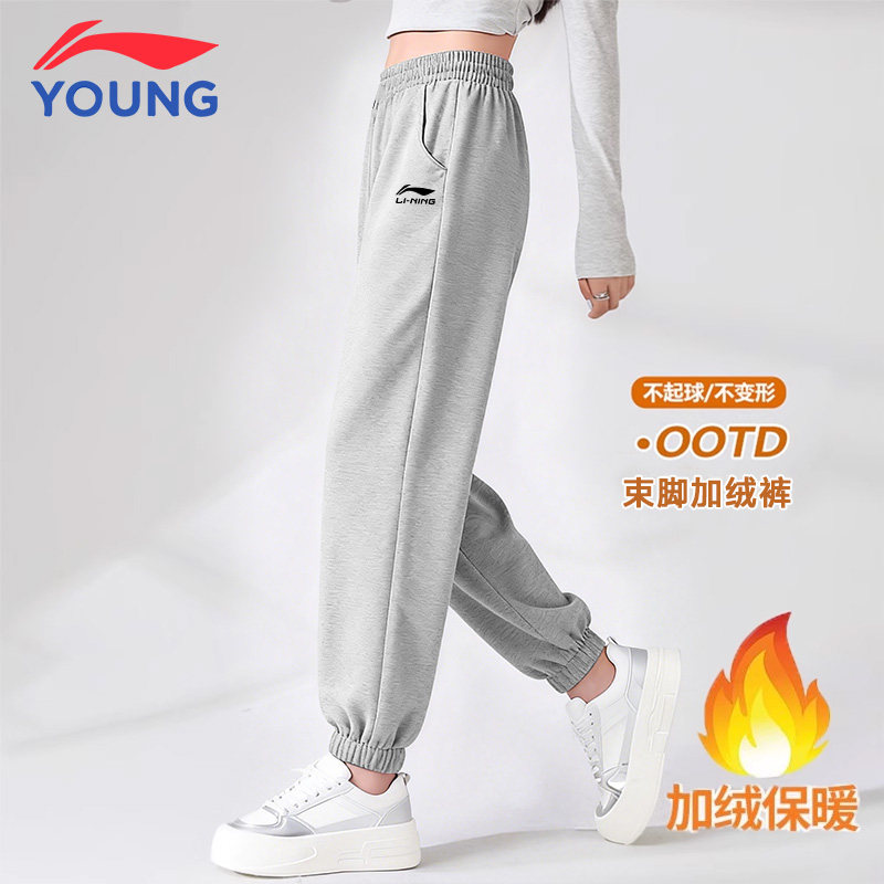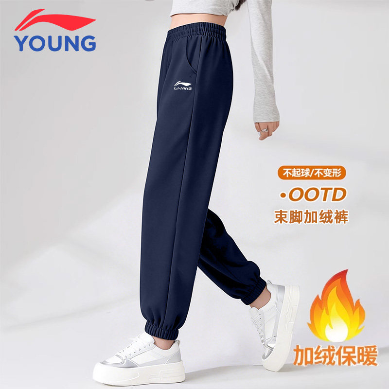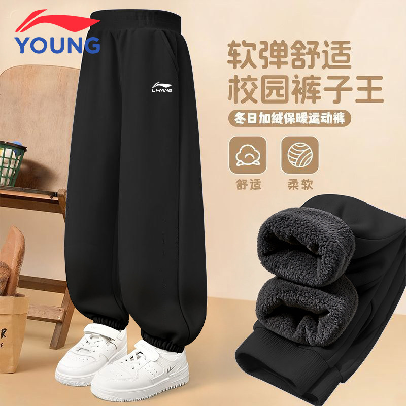 李宁女童裤子加绒加厚秋冬季儿童卫裤运动裤青少年保暖休闲裤长裤