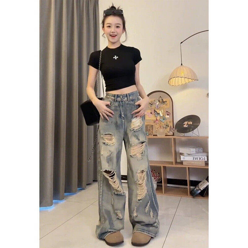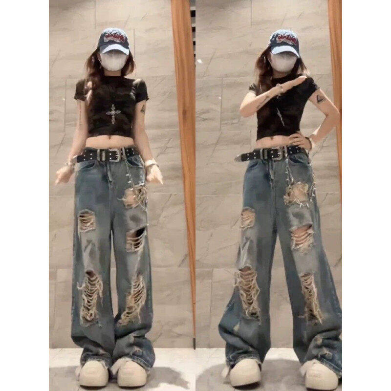 美式复古乞丐破洞牛仔裤男女款2025夏季流行单品潮牌宽松阔腿裤子
