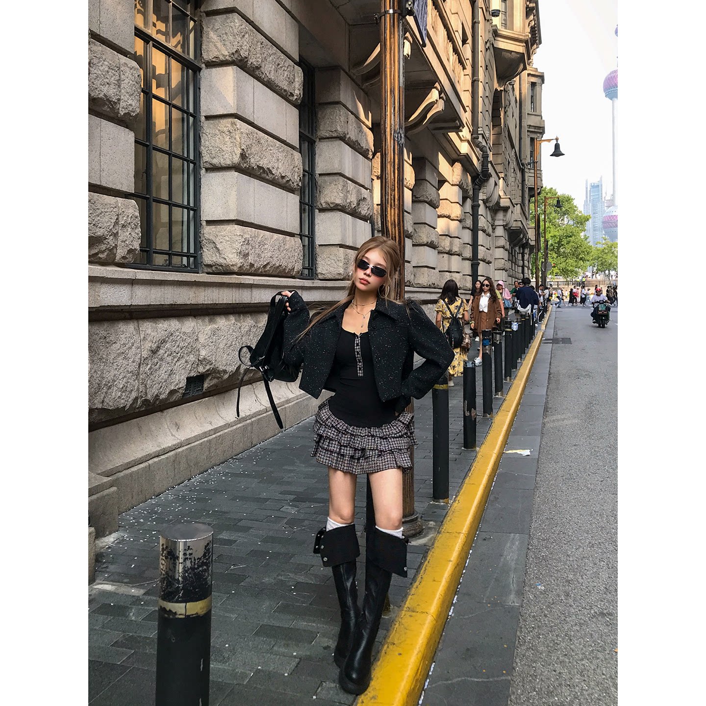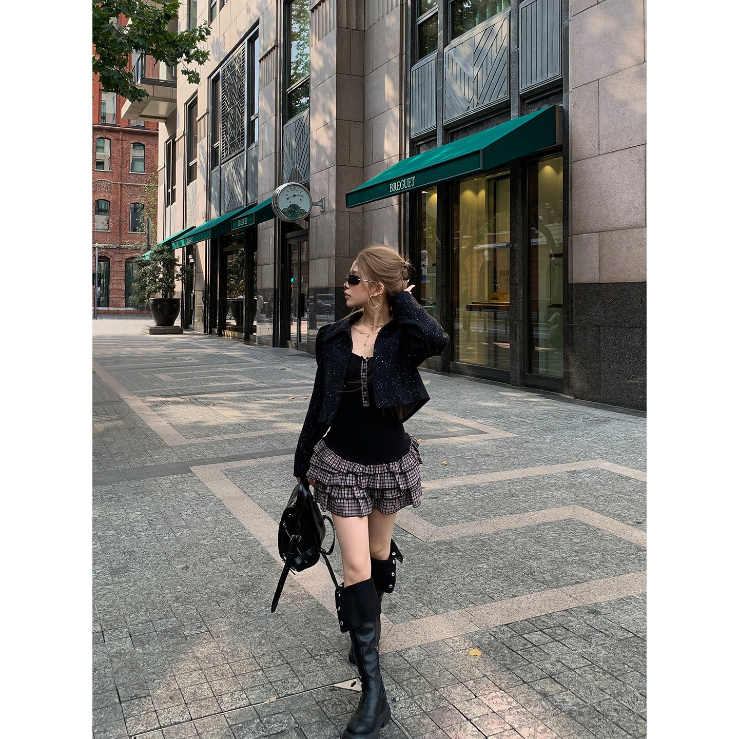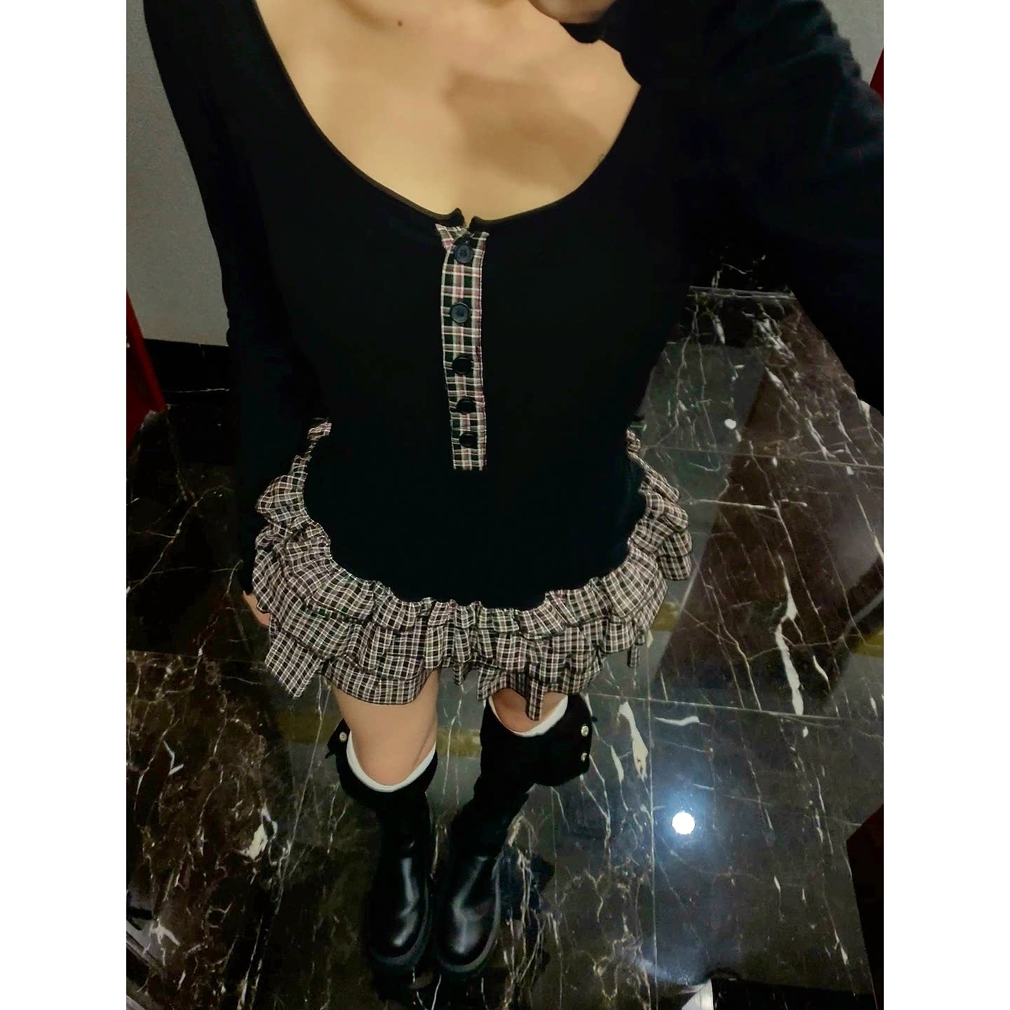 CAFE ROSE 长袖格纹拼接连衣裙女冬装新款修身显瘦内搭短款蛋糕裙