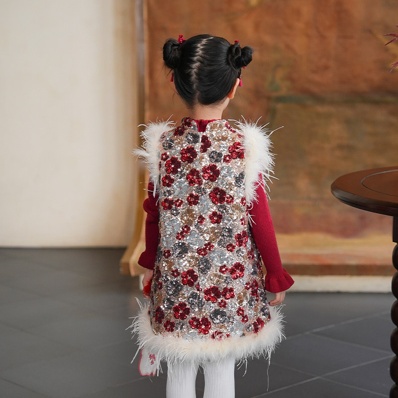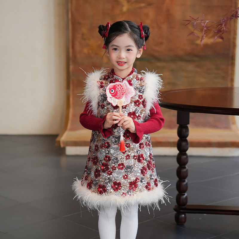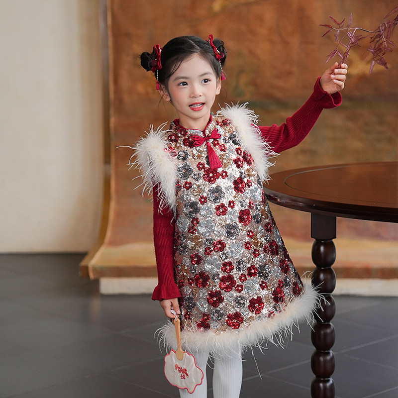 女童连衣裙冬季2025新款高级感重工设计驼鸟毛立体珠绣亮片旗袍裙