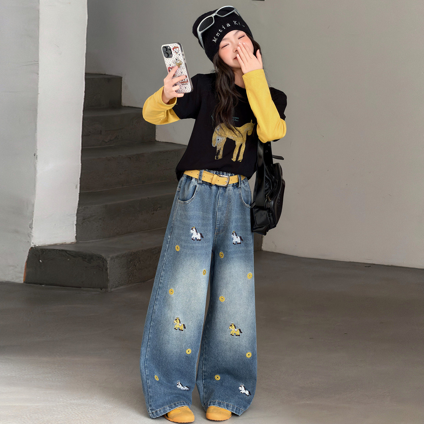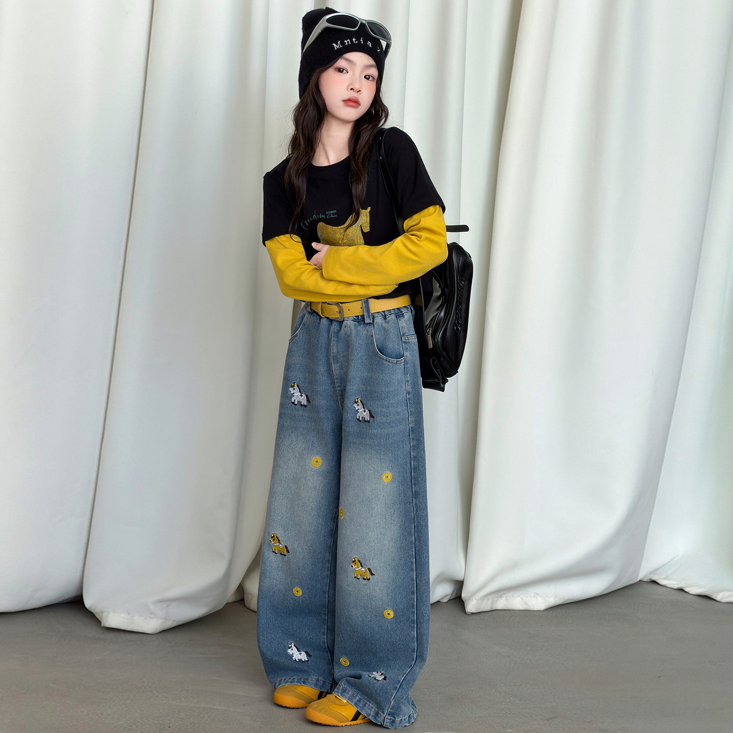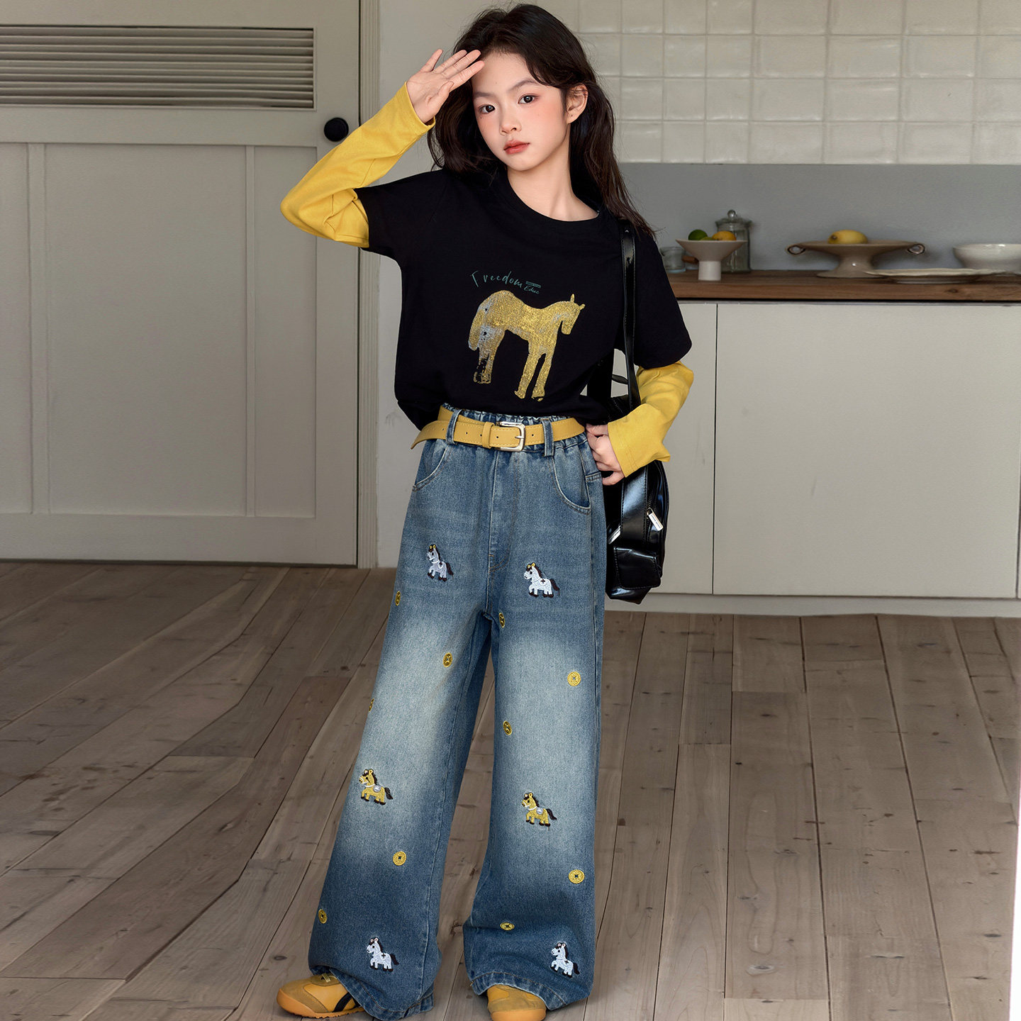女童套装春款2026韩系新款中大童假两件上衣牛仔裤时尚女生两件套