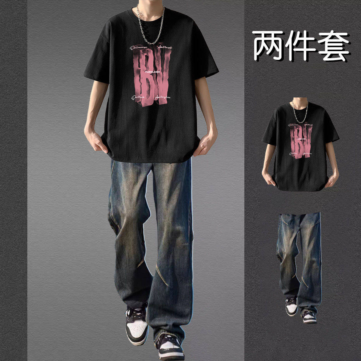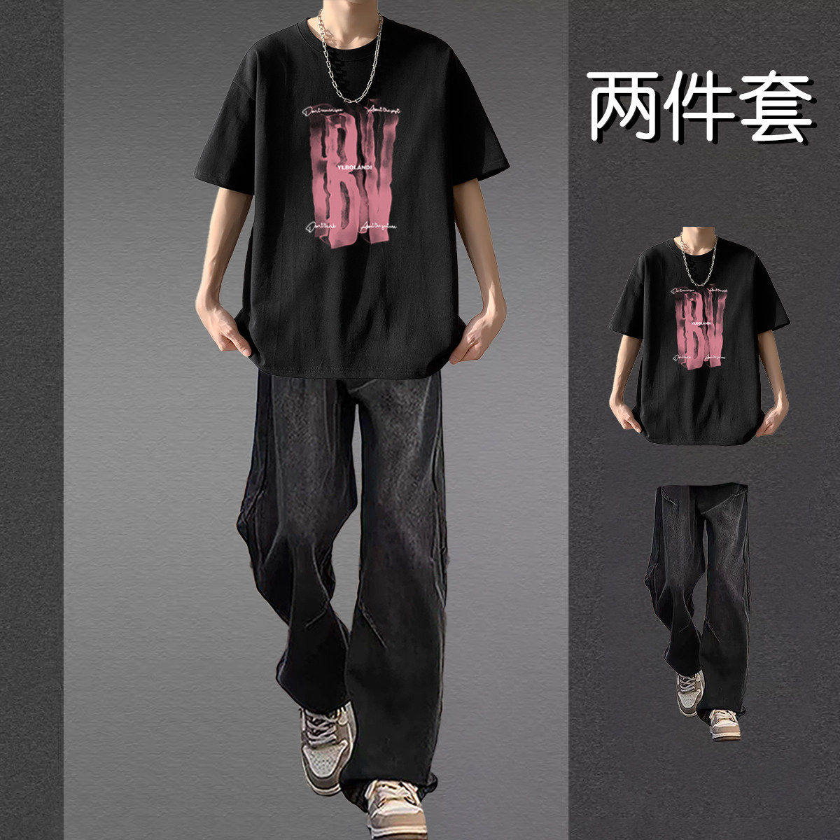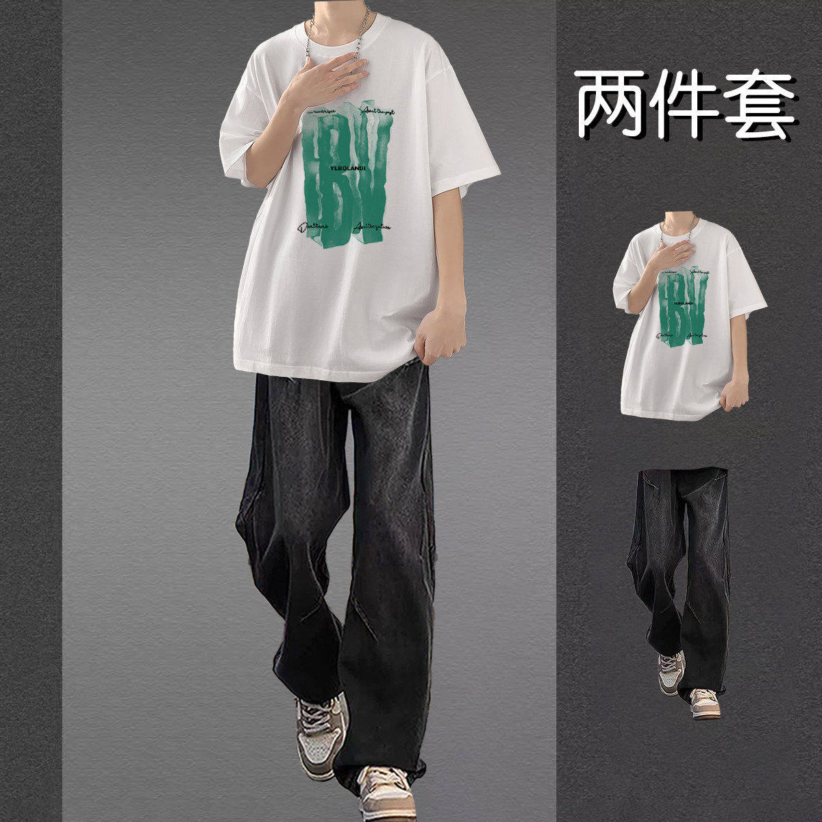 美式潮牌短袖T恤男士夏季套装帅气两件套男装青少年休闲运动套装