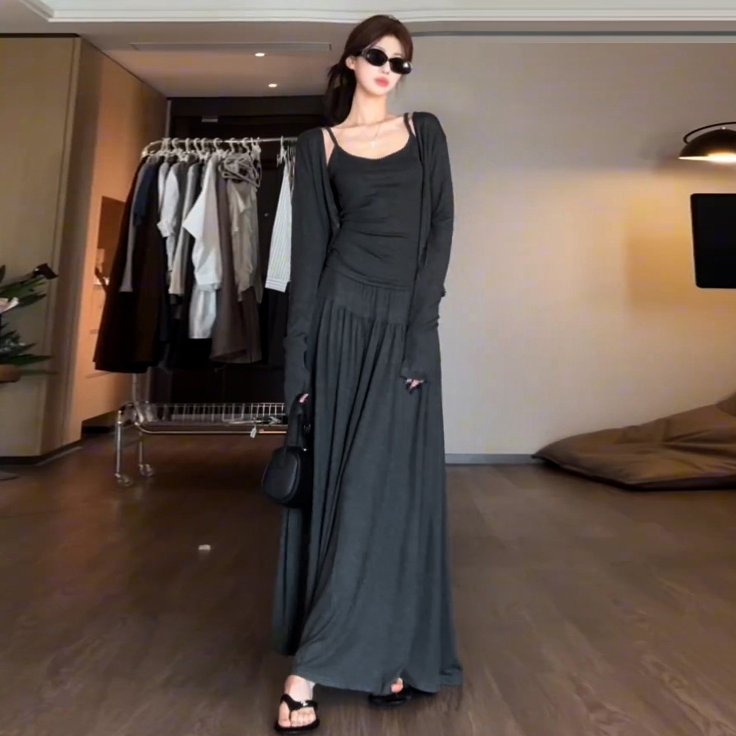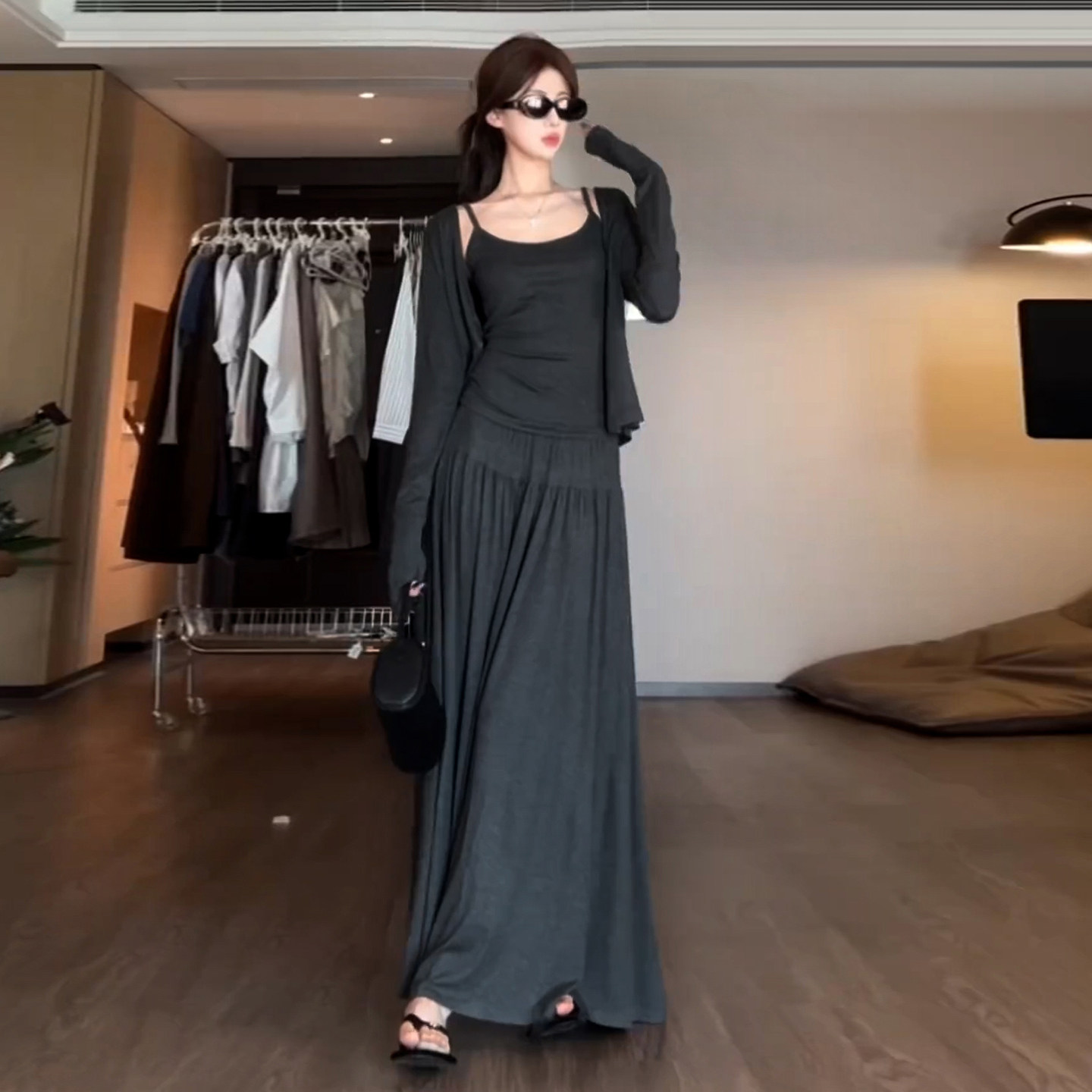 法式慵懒风灰色连衣裙子女早春冬2026新款韩系高级感收腰套装长裙