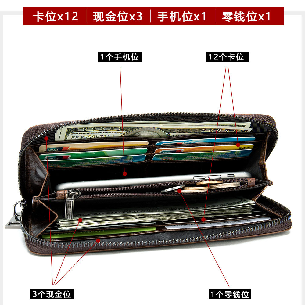 亚马逊男士长款钱包 真皮鳄鱼纹商务多卡位手拿包头层牛皮钱夹男