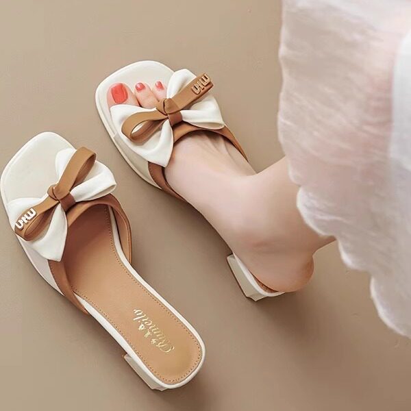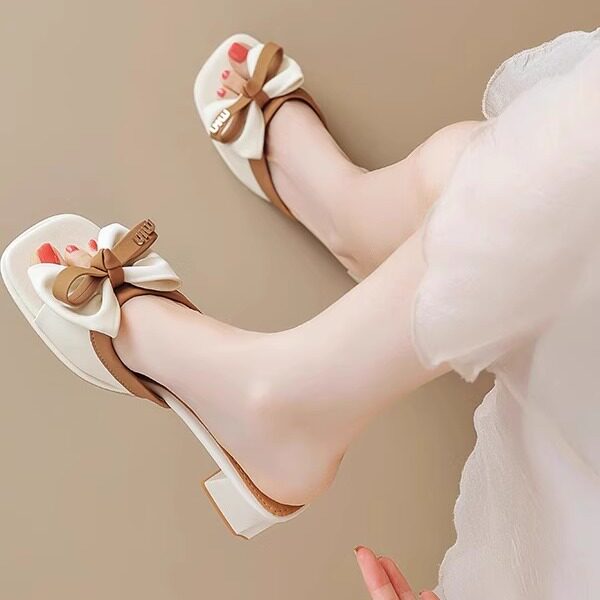 品牌鞋真皮高跟拖鞋女2026夏款外穿法式粗跟高级感一字拖蝴蝶结拖