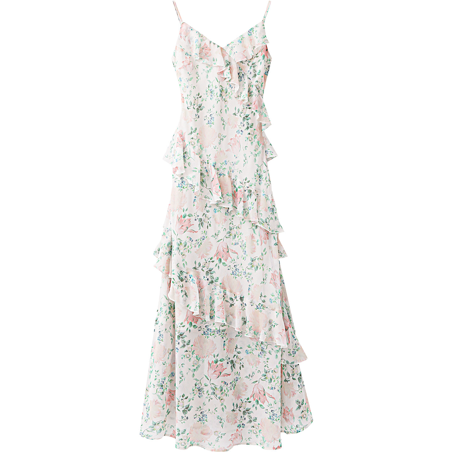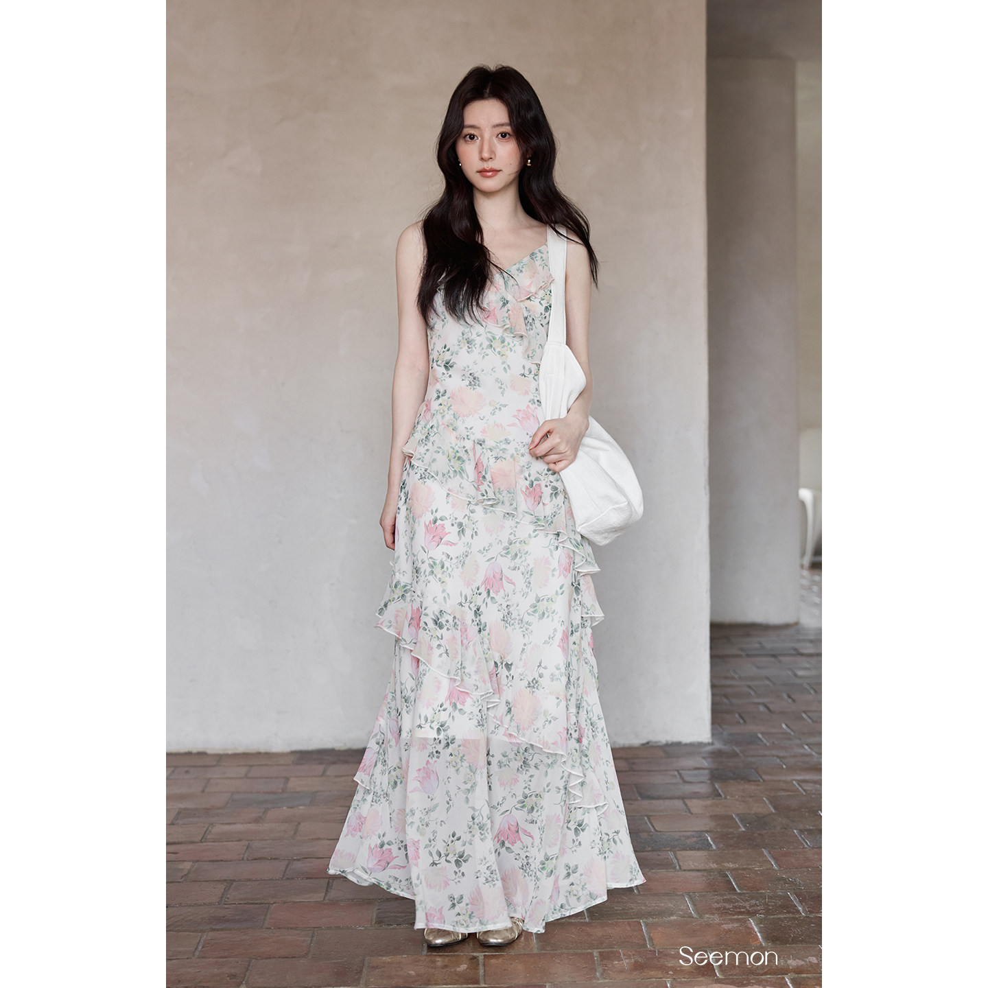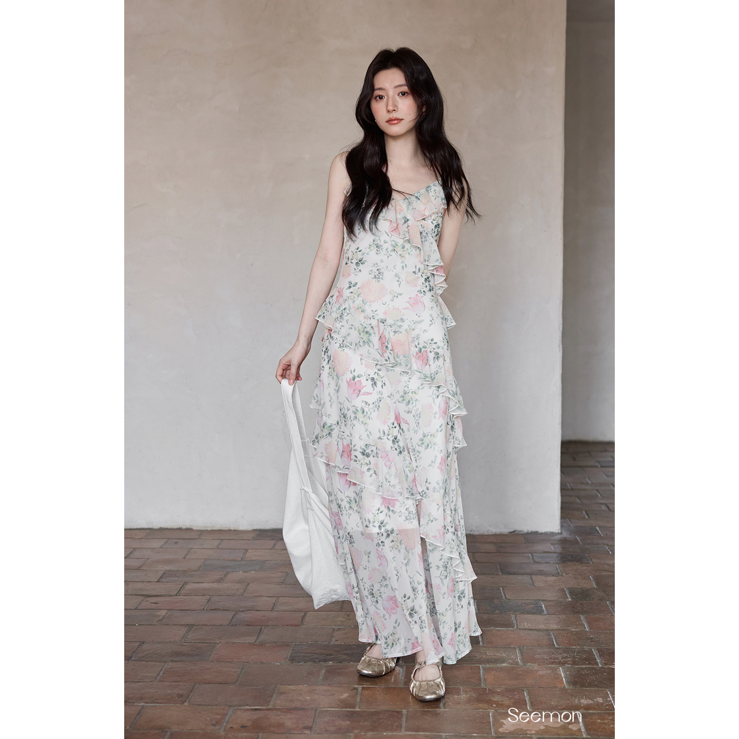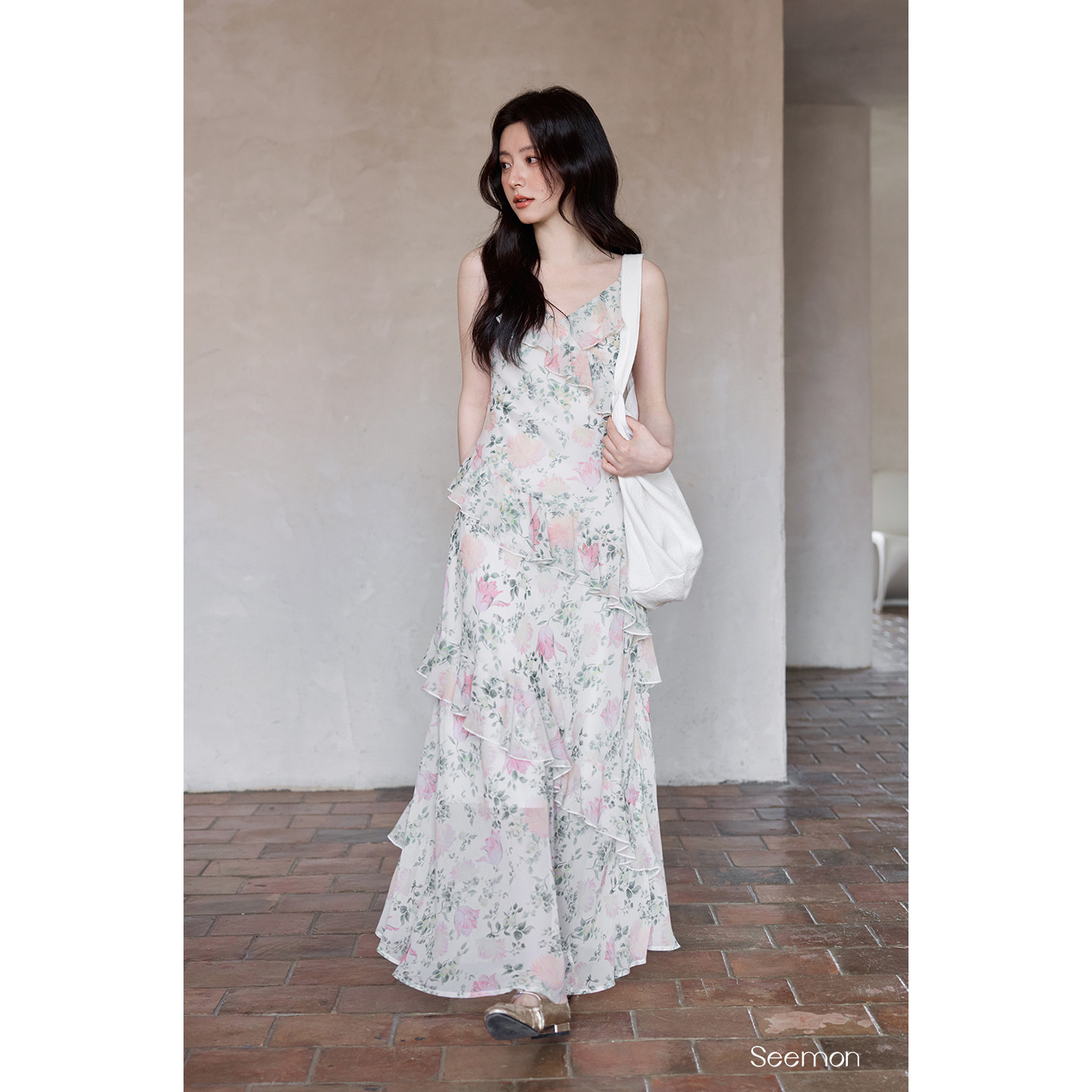 夕蒙2026新款夏季韩系裙子海边荷叶边粉绿色碎花长款吊带连衣裙女