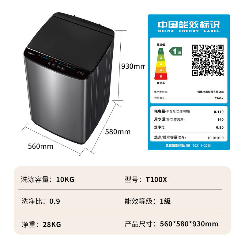 创维洗衣机10公斤波轮家用一级能效出租房小户型优选T100X