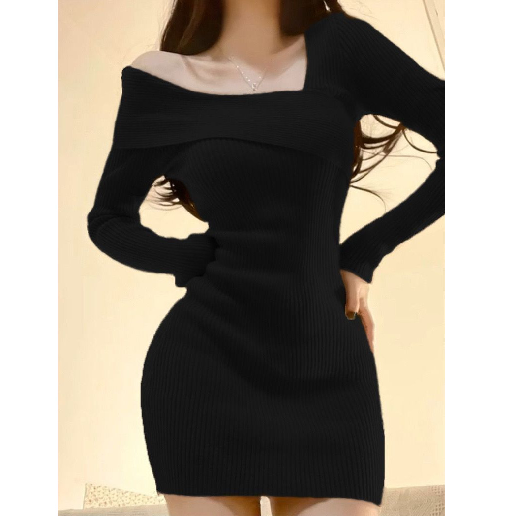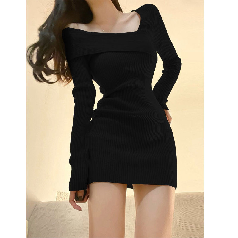 纯欲辣妹修身显瘦包臀裙女秋冬内搭打底斜肩针织螺纹磨毛连衣裙潮