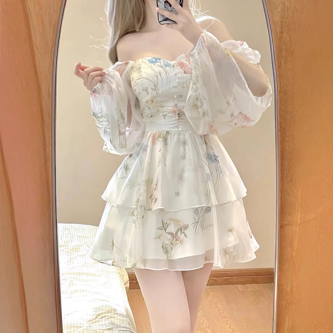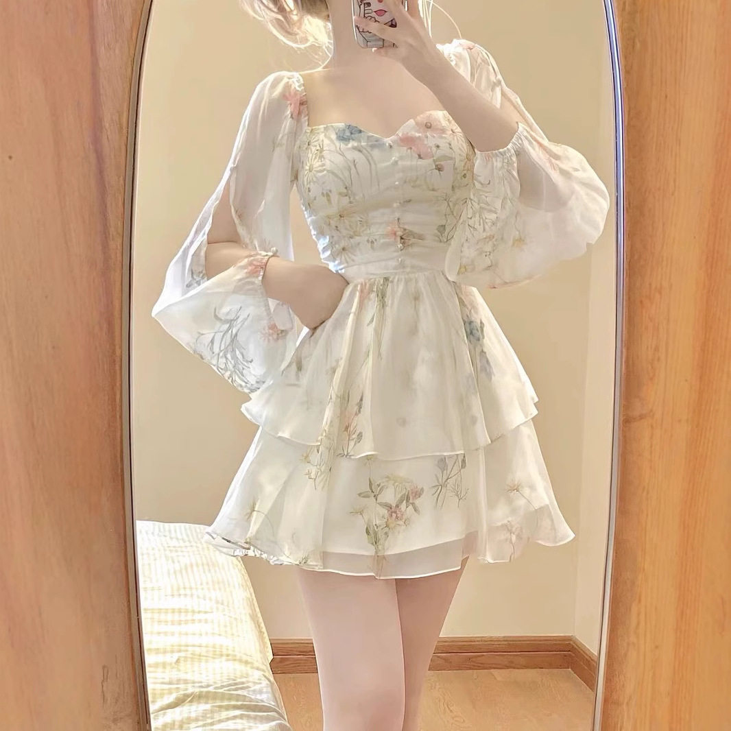 法式雪纺碎花连衣裙女夏季高级感气质仙女不规则裙收腰小个子短裙