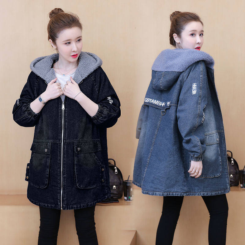 秋冬中长款加绒加厚女士棉衣棉服2026新款胖mm高级感连帽牛仔外套