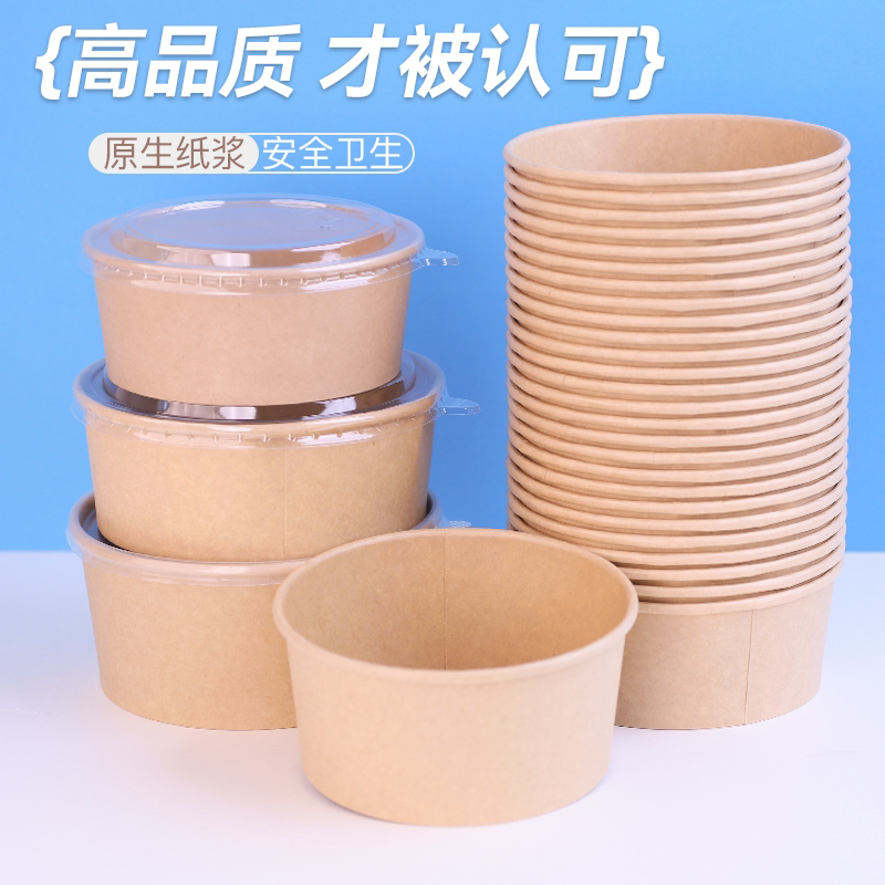 一次性牛皮纸打包盒圆形水果盒沙拉碗野餐可微波外卖加厚牛皮纸碗
