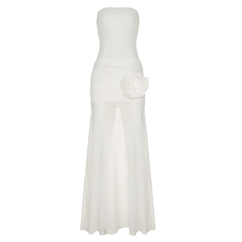 ROCKMOREW【海岛度假】立体花朵抹胸飘逸长裙性感白色网纱连衣裙