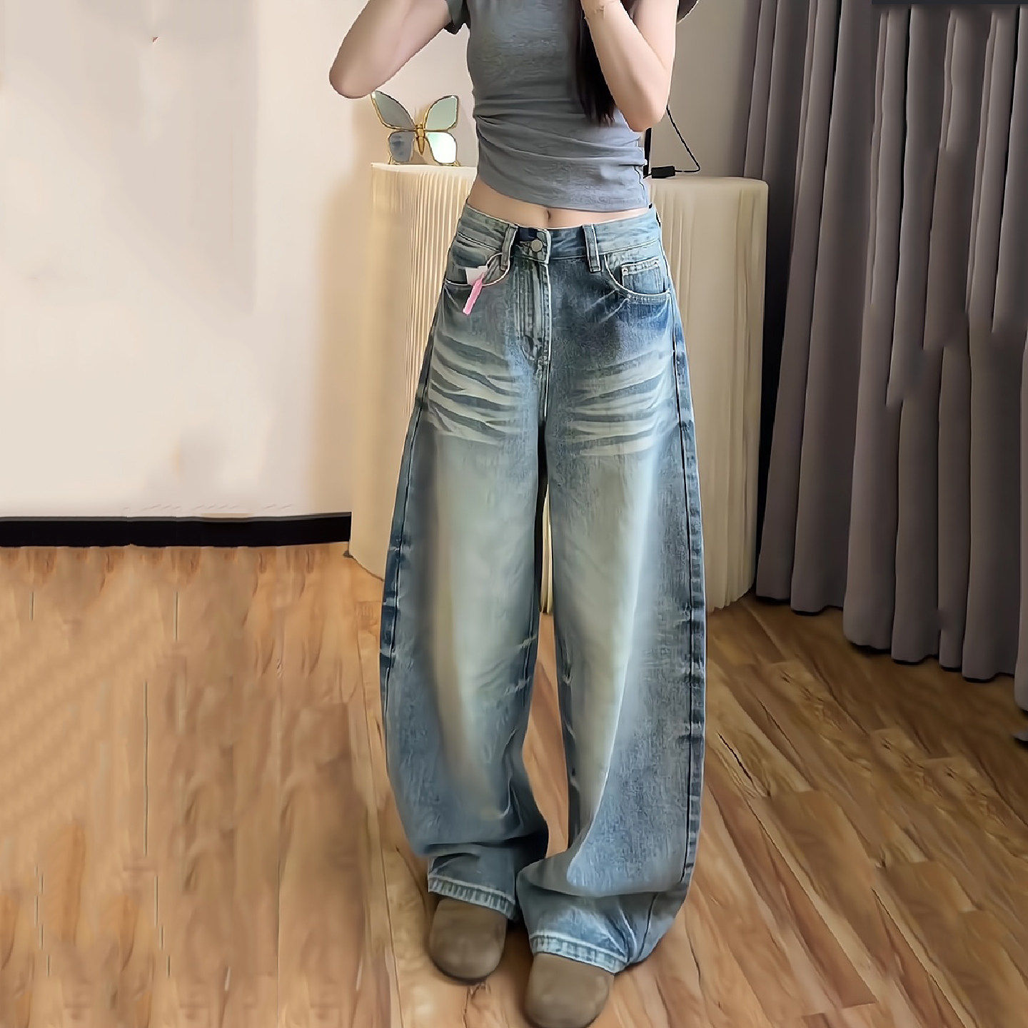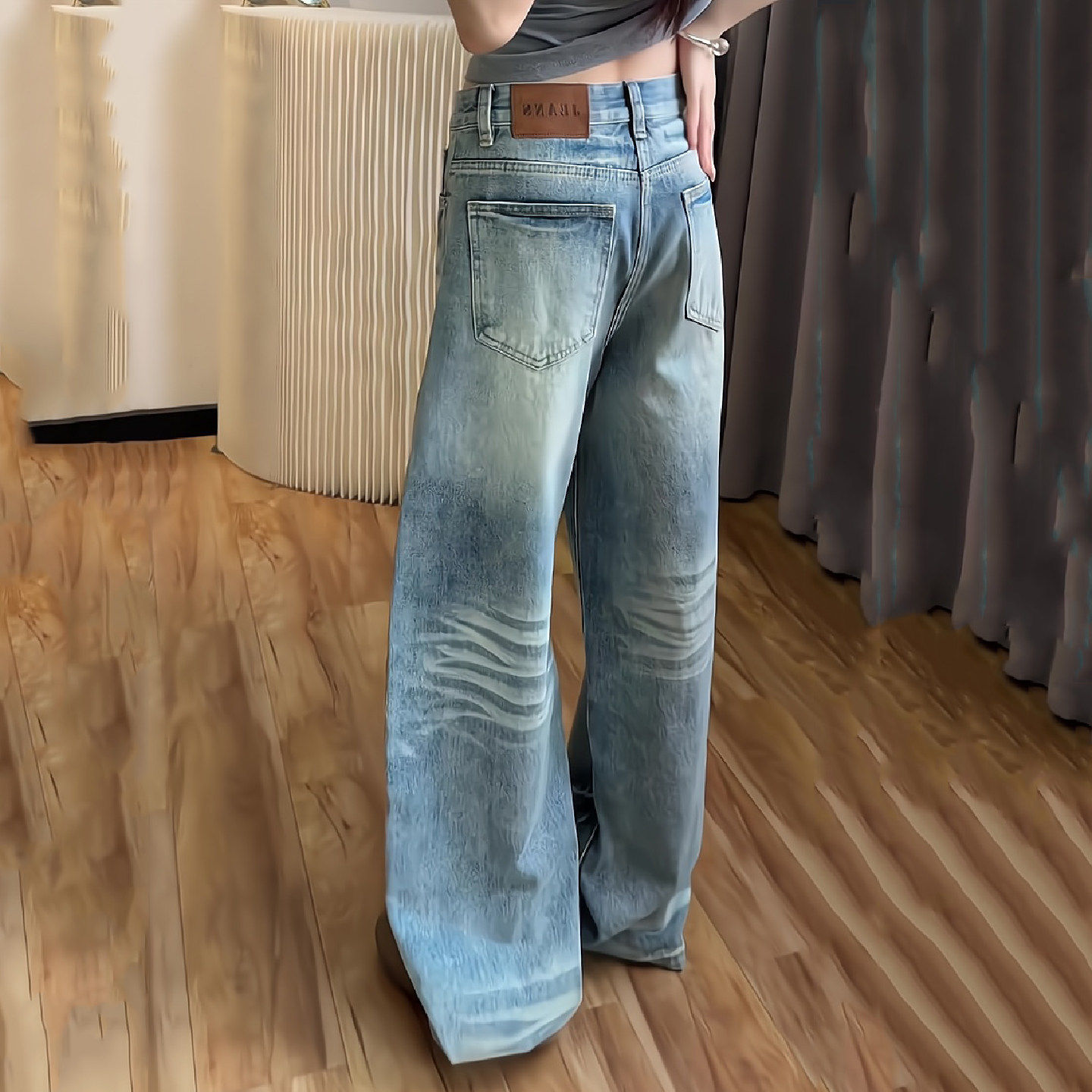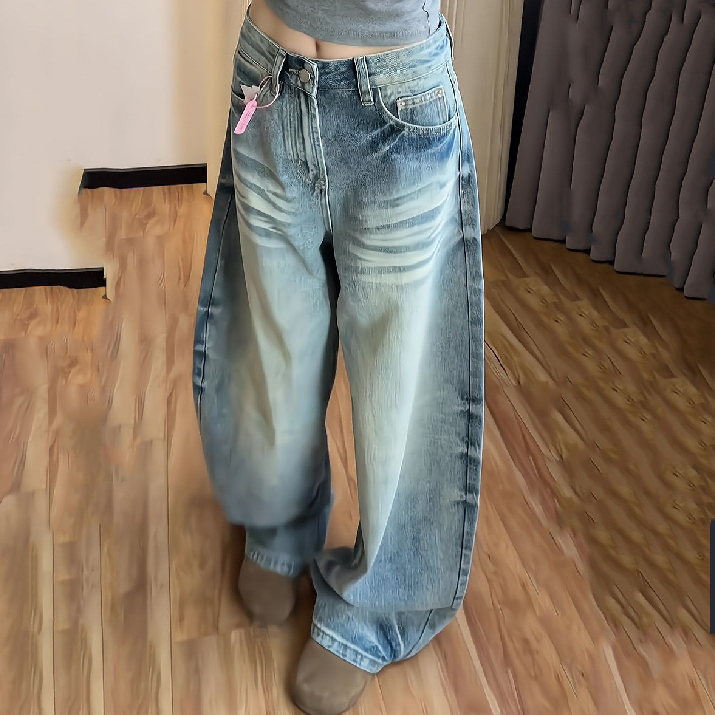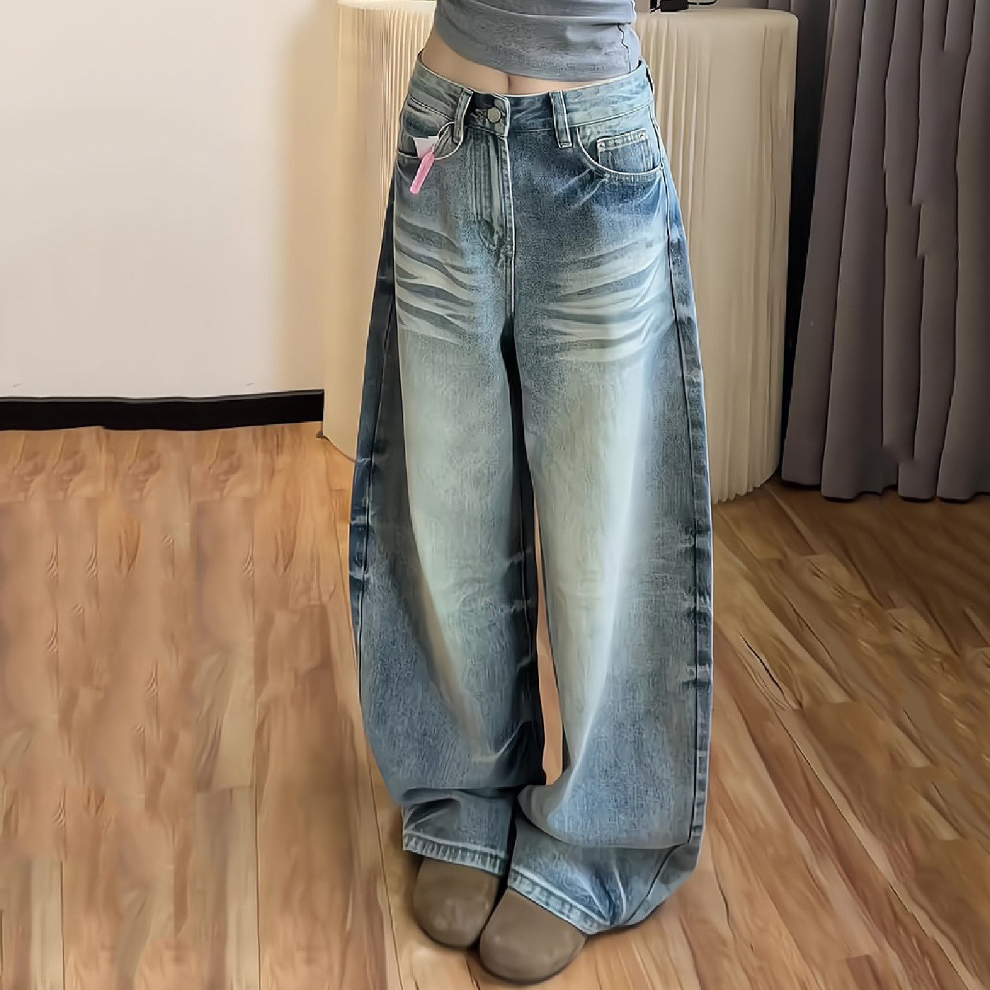 2026春夏季新款美式复古牛仔裤女高腰宽松休闲阔腿裤猫爪纹弯刀裤