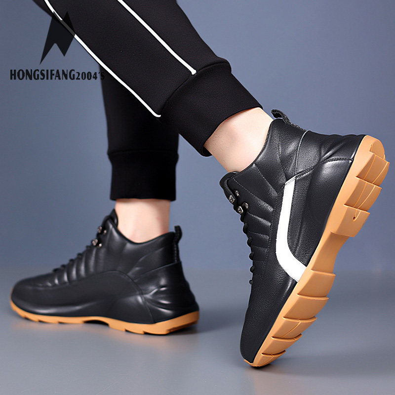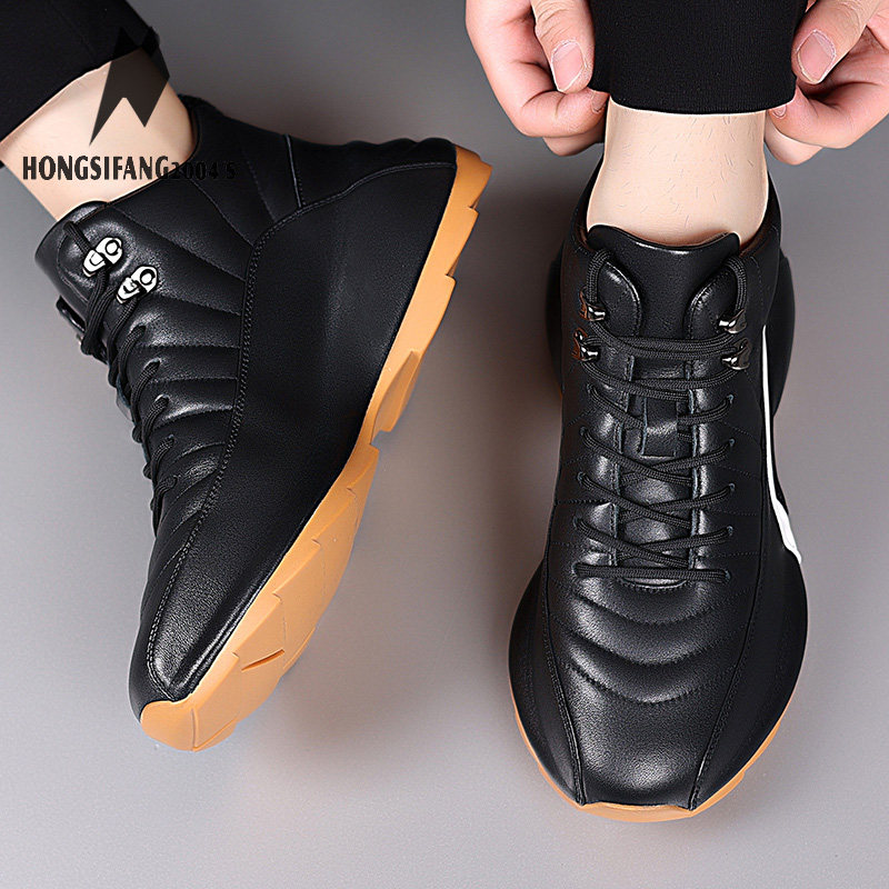 男生潮流冬季加绒高帮休闲皮鞋隐形内增高透气男士黑色休闲鞋子男