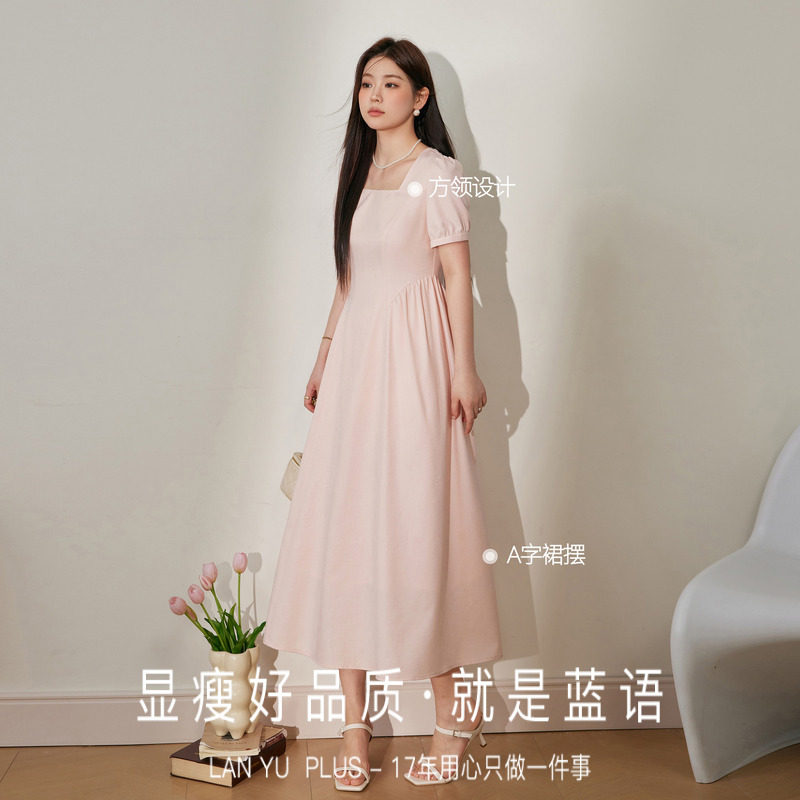 蓝语大码女装胖mm法式方领粉色连衣裙夏季新款收腰显瘦海边a字裙