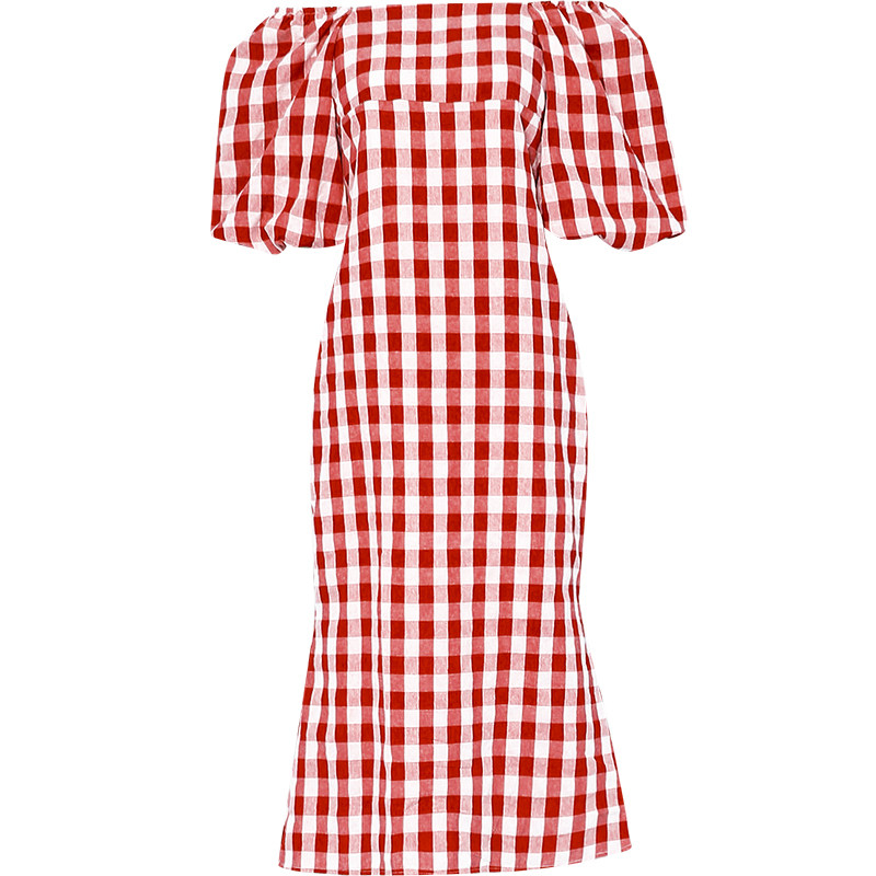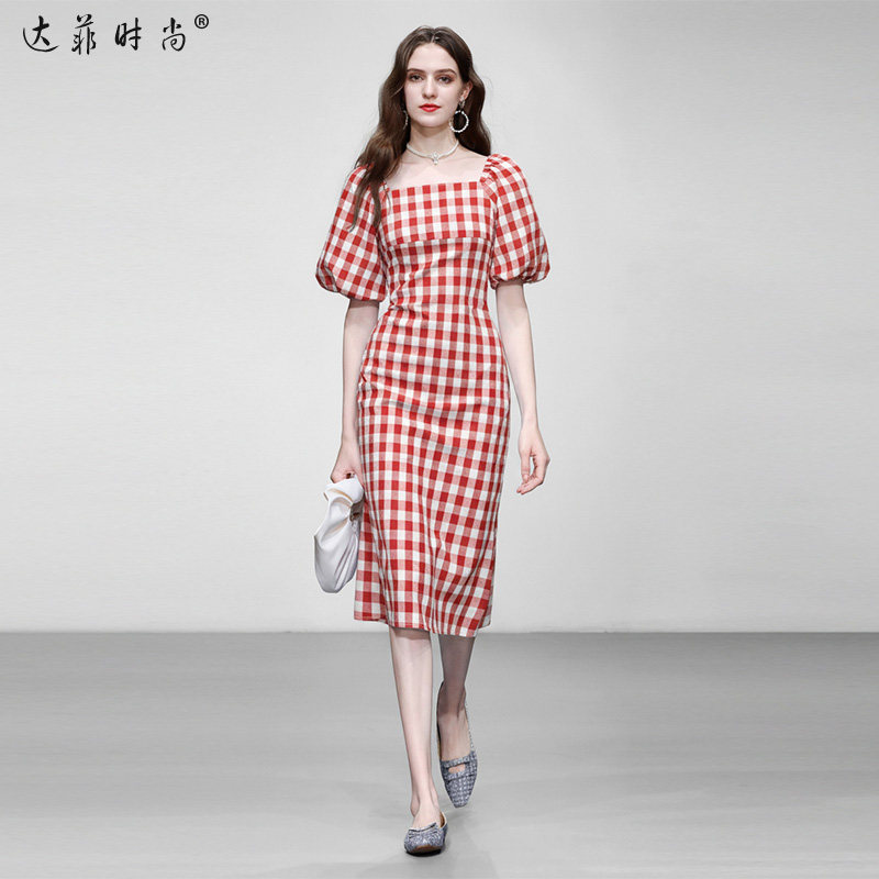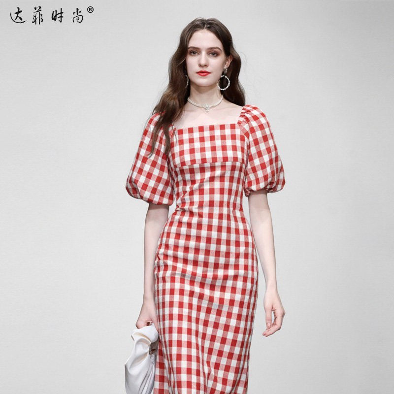 夏季女装2026新款甜美减龄红白格纹泡泡袖修身收腰显瘦连衣裙长裙