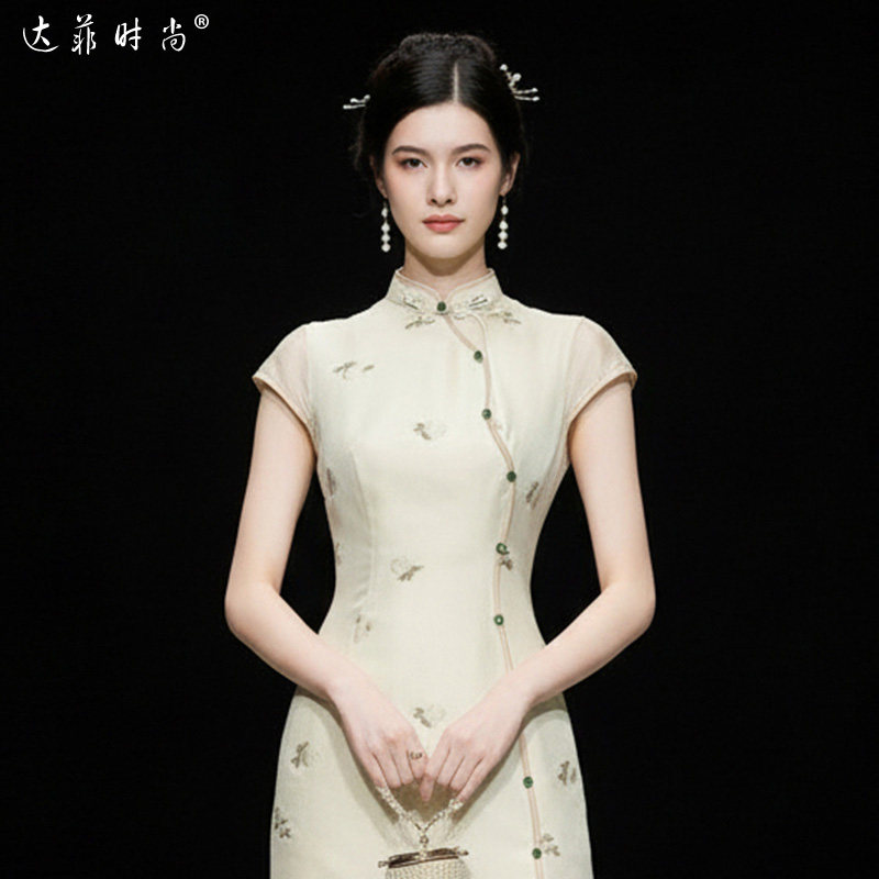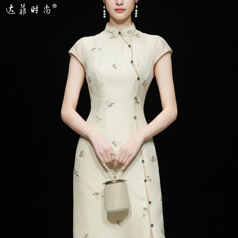 夏季女装2026新款气质杏色短袖修身收腰旗袍连衣裙纱裙长裙